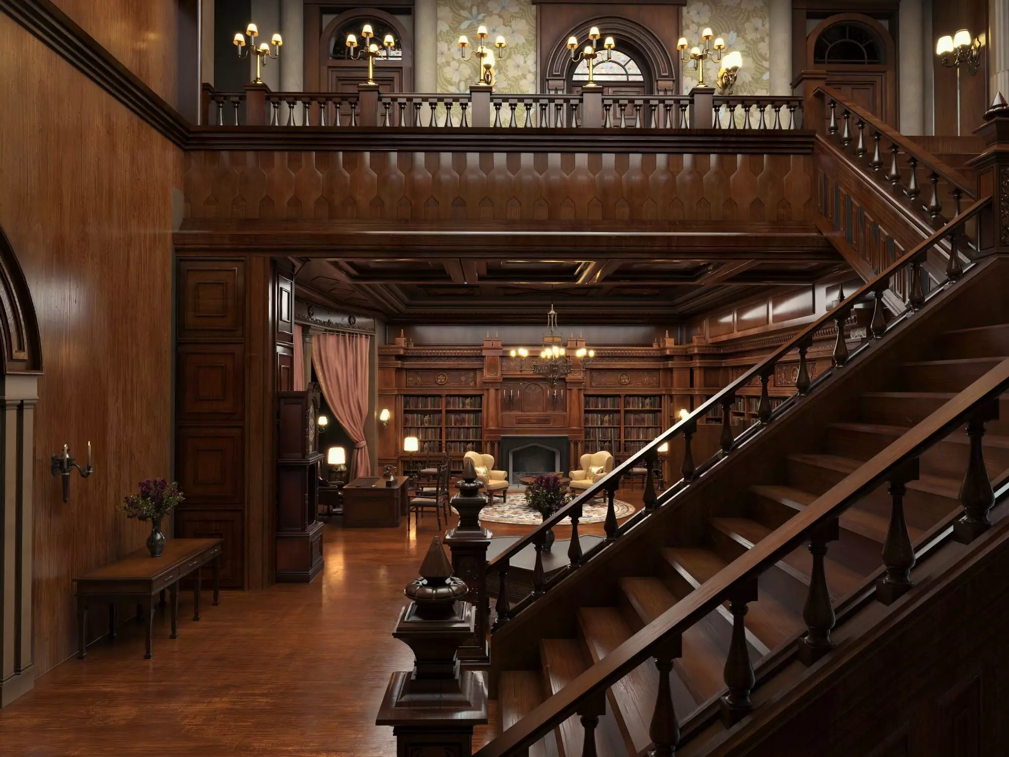Step into a world of timeless elegance with this hyper-realistic grand mansion interior. This meticulously crafted environment features a prestigious two-story library and lobby, anchored by a magnificent dark-wood spiral staircase and floor-to-ceiling custom bookshelves. The scene is enriched with intricate architectural moldings, coffered ceilings, and classic leather-bound book assets. Optimized for cinematic lighting, the warm mahogany tones and sophisticated furniture arrangements (including classic armchairs and a stately fireplace) create a majestic atmosphere. It is an ideal hero environment for high-end real estate visualization, period-piece film backgrounds, and luxury VR walkthroughs.