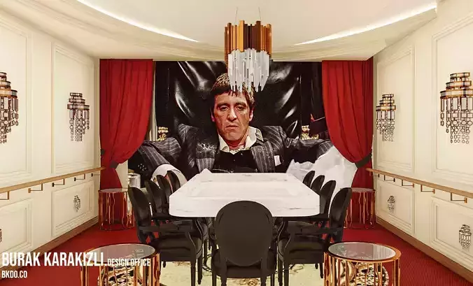 This exclusive 3D model collection features a meticulously designed luxury boardroom and lounge area inspired by iconic mafia movie aesthetics. The design captures an opulent atmosphere with elegant chandeliers, rich red carpets, classic panel walls, and plush seating arrangements. Ideal for architectural visualizations, high-end interior design projects, or cinematic environments, these models include high-resolution textures, detailed furniture, wall sconces, and ambient lighting setups.