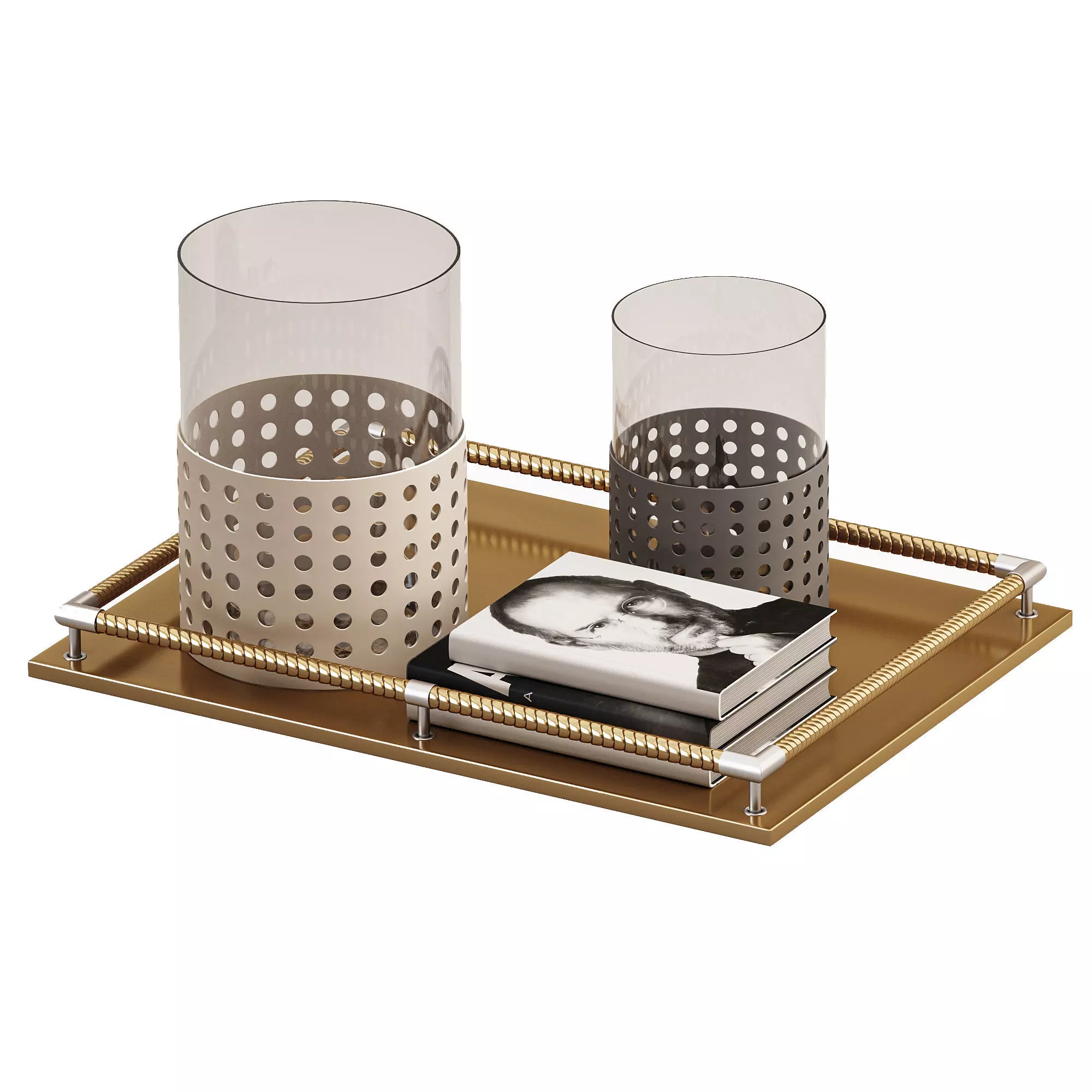 Name: Mimosa Large Moka GiobagnaraType: modelFormat: 3Ds Max 2016Export: FBX, OBJRender: Corona (10)Polys: 166718Verts: 166224Matclasses: CoronaLegacyMtlUnits: MillimetersDimension: 1165.25 x 856.35 x 604.53Description: A luxury decorative tabletop set featuring two cylindrical glass containers with perforated metal bases in contrasting moka and beige tones, placed on a rectangular golden tray with metallic rope-style handles. The model also includes a photo book stack, adding an elegant touch. Perfect for high-end interior scenes and product visualizations requiring refined details and realistic materials.Tags: tabletop decor, luxury tray, Giobagnara, moka finish, glass candle holder, metal perforated container, interior accessories, coffee table decor, modern tabletop, book stack 3D, realistic glass, Corona Renderer, decorative setup, high poly model, home decor 3D, design object, interior visualization, luxury interior, detailed decor model, stylish setup