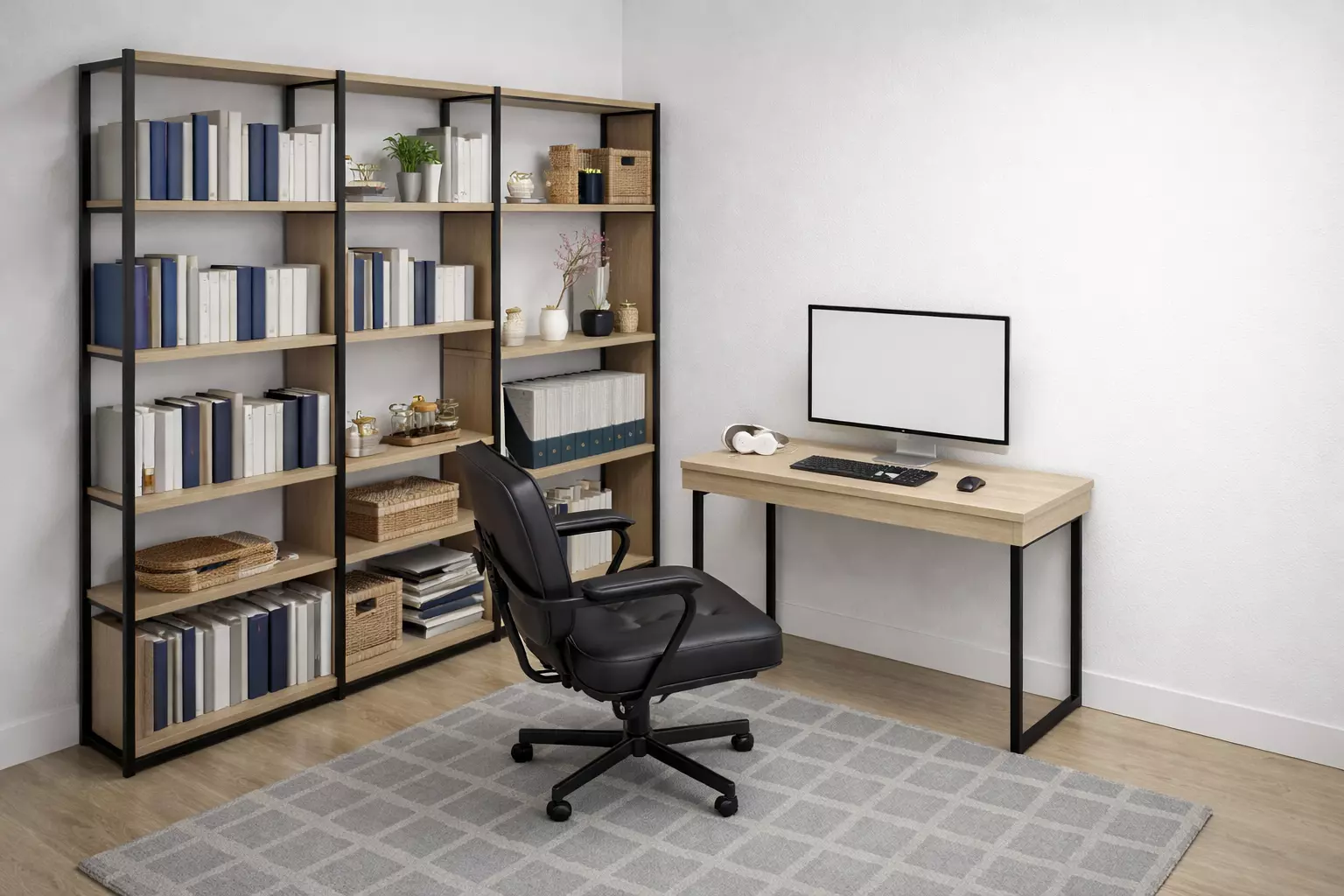 A clean and functional home office setup featuring a desk and integrated bookshelf workspace. Designed for modern interior scenes, this asset provides a balanced composition suitable for productivity-focused environments.