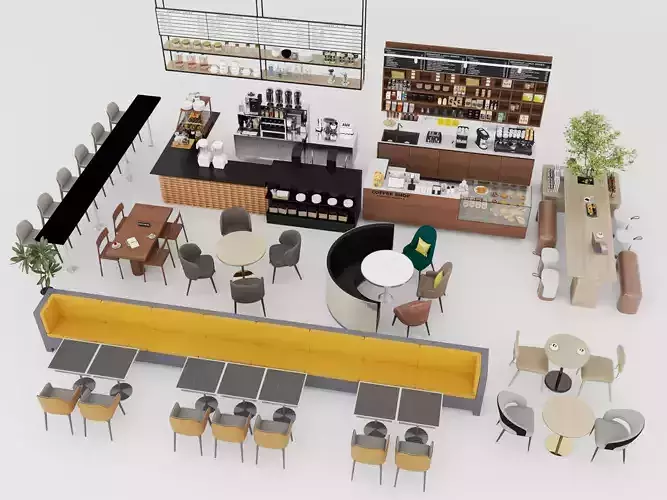 High-quality modern coffee shop interior 3D model and furniture pack, designed for architectural visualization, interior design, games, animation, and commercial projects.