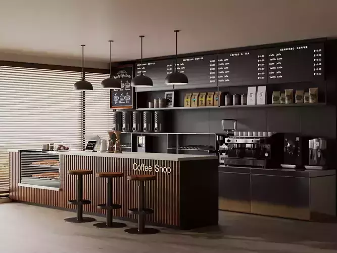 This modern 3D coffee shop interior scene features a sleek and modern design, creating a realistic commercial coffee shop atmosphere.