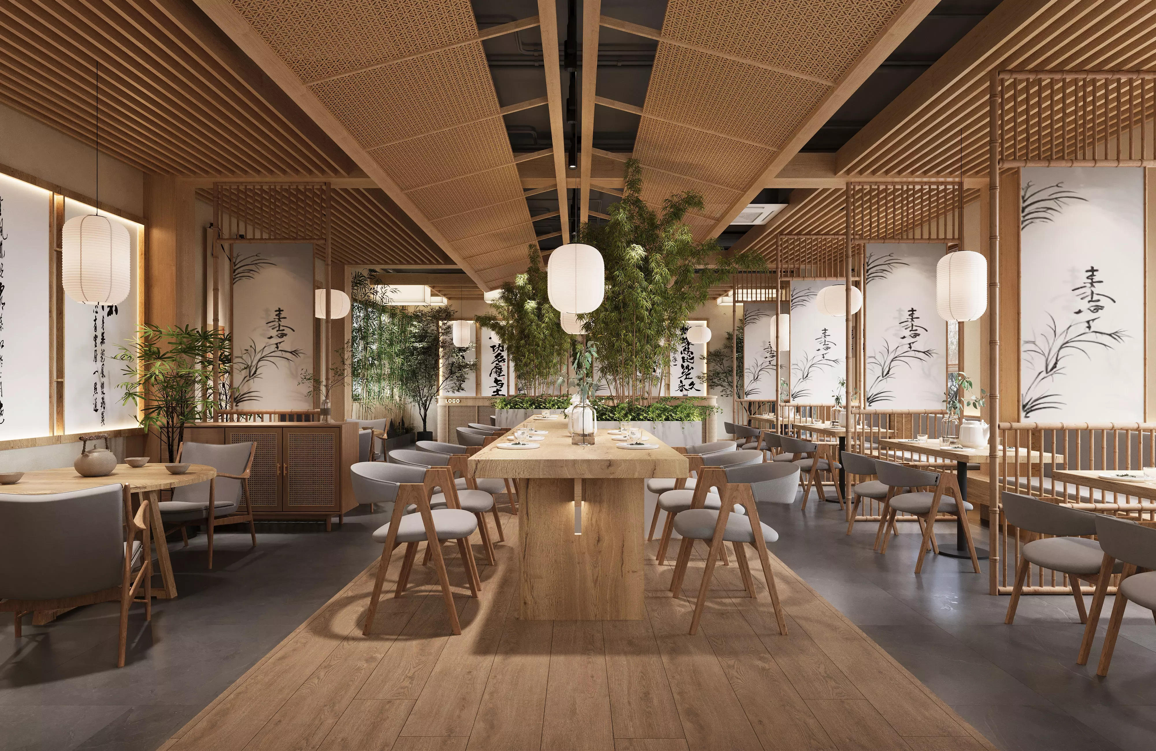 This scene features light log color as its dominant tone, paired with soft warm lighting. Its overall style blends natural textures with Oriental aesthetics, creating a fresh and elegant dining atmosphere that perfectly aligns with the vegetarian tea restaurant’s positioning of light meals, tea tasting, and a slow-paced life.