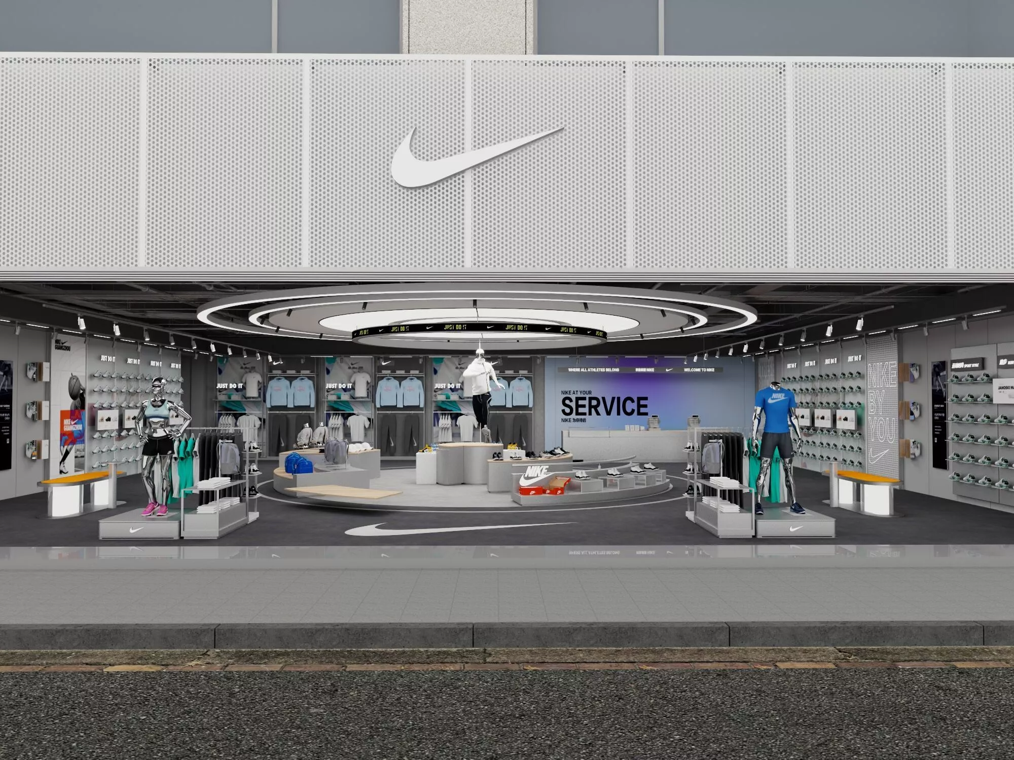 Professional high-quality 3D complete scene of a Modern Nike Flagship Retail Store meticulously crafted for high-end commercial visualization retail mall planning and brand environment projects. This comprehensive asset features a fully equipped brand store including the iconic illuminated Nike Swoosh facade circular LED ring lighting systems professional footwear display walls apparel hanging racks interactive service counters and high-fidelity sport mannequins showcase realistic retail textures and materials.