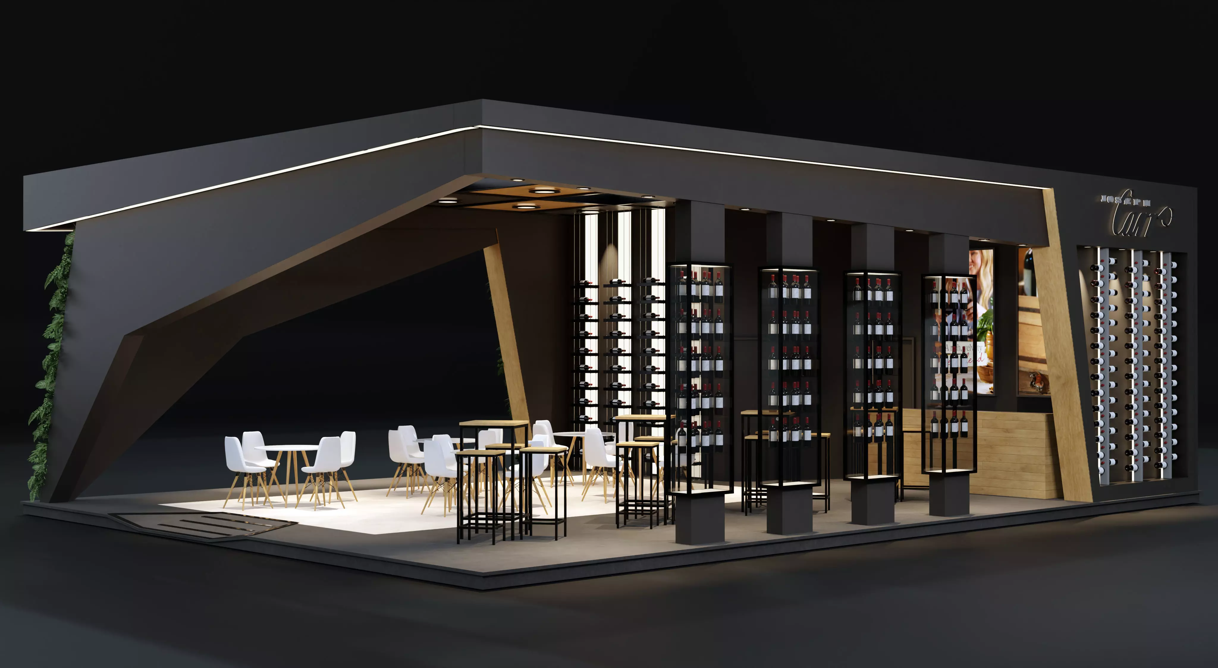 The booth includes dedicated wine display racks, modern shelving systems, a welcoming customer seating area, and an open layout that allows smooth visitor flow. Carefully placed lighting elements enhance the premium feel and highlight product display areas, making the model suitable for high-end presentations and marketing visuals.