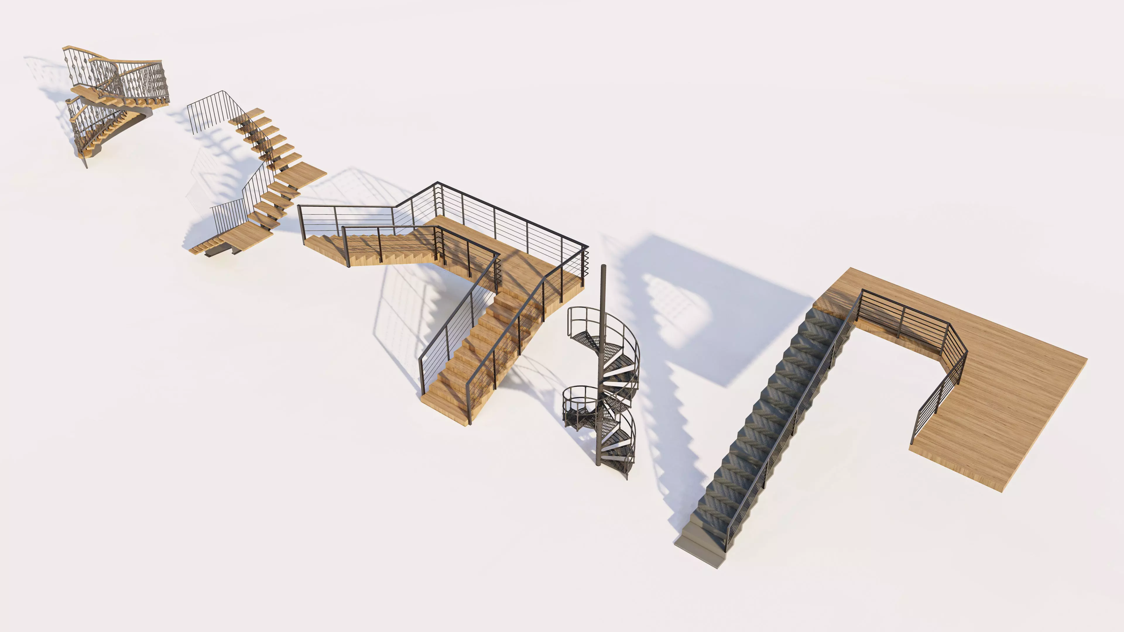 This is a premium 3D model collection of Modern Wood and Metal Staircases, designed for high-end residential and commercial architectural visualizations. This pack features a variety of contemporary structural designs, including floating treads and industrial-chic metal frames, providing a sophisticated vertical circulation solution for open-plan interiors.