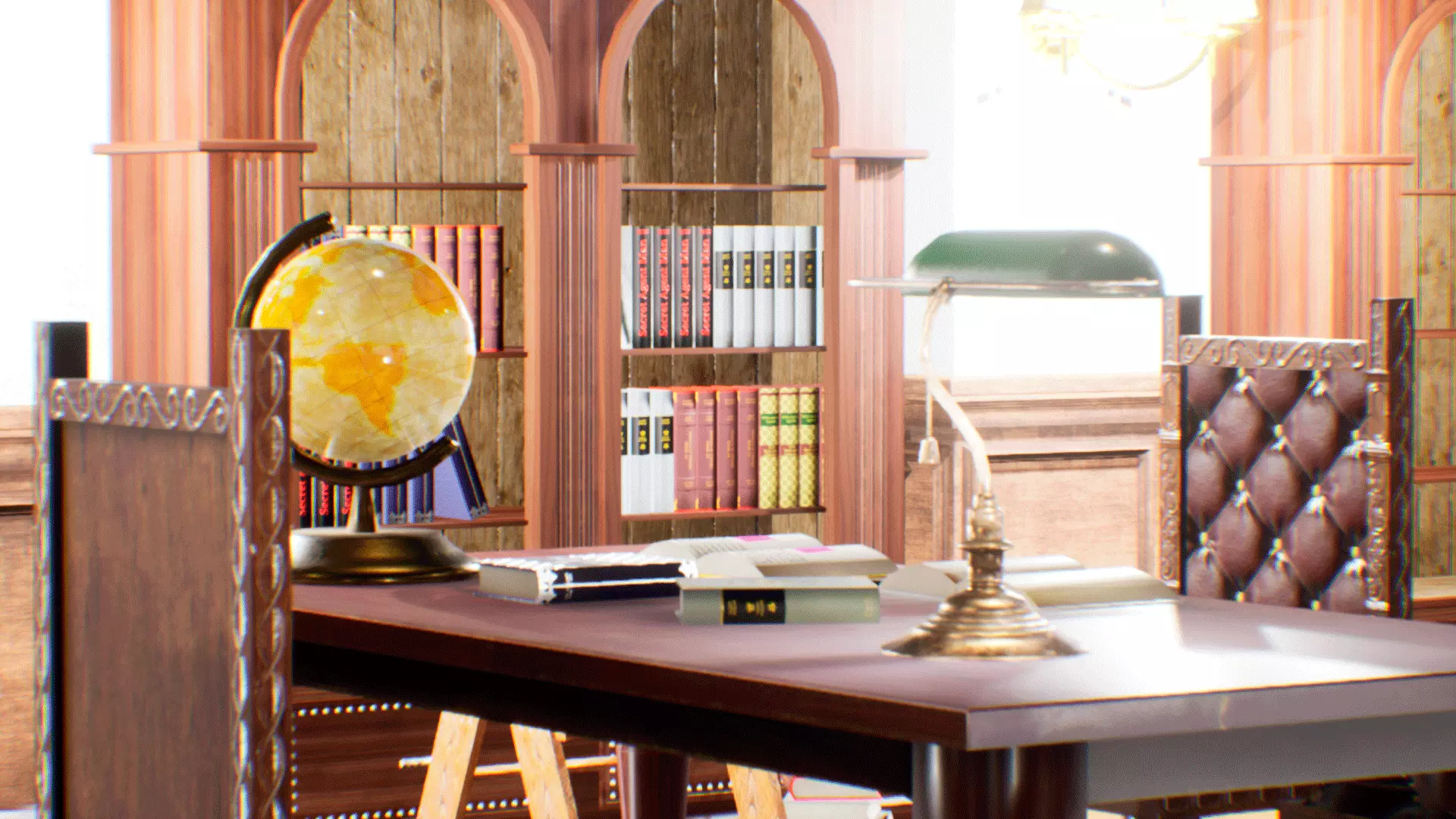 Assets Modular Building.Furniture: Bookcase, Chair, Reading Table.Technique: Chandelier, Desk Lamp, Laptop.Other props: Book, Earth Globe, Fence, Ladder, Leather Bag, Plant.