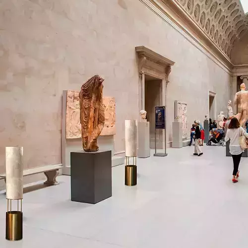 The Muse Floor Lamp is a luxurious and sculptural lighting piece that blends classic elegance with modern craftsmanship. Featuring a perforated brushed brass base and a tall alabaster-like cylindrical shade, this floor lamp is ideal for museums, art galleries, and high-end interiors seeking to merge function with aesthetic presence.