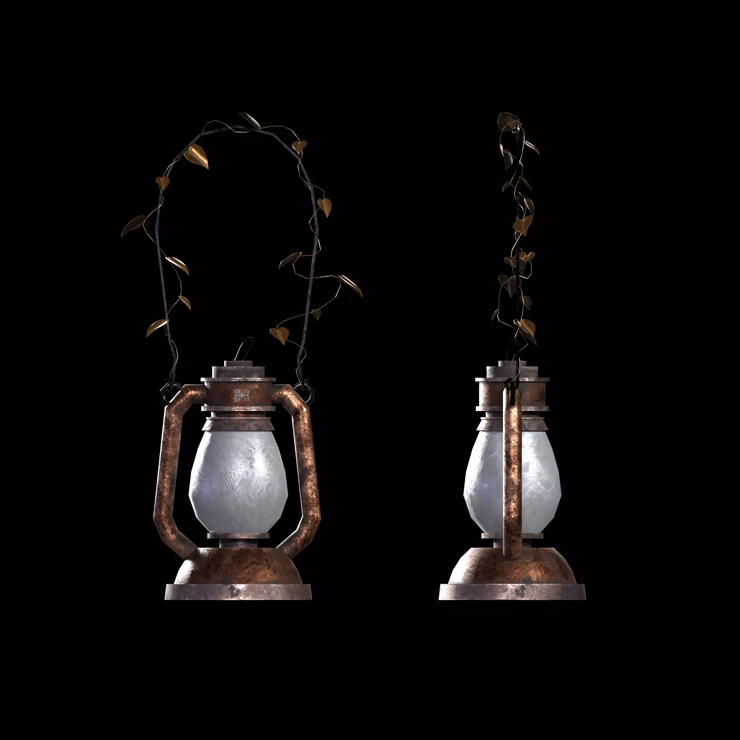 Decorated with metal vine with gilded leaves old lamp, ready to use. It has an old glass that has lost its clarity over time and has developed a few cracks. The metal from which the lamp body is made has traces of time: scratches, rust, dirt. A symbol is visible on the top of the lamp. There is a small handle on the top to hold this lamp. The most beautiful and best part of this model is the metal vine around which are the metal leaves, covered with gold. The leaves have a bright light side, which faces the sun, and a dark lower side. The leaves are all different sizes and there is a natural asymmetry in the vine.