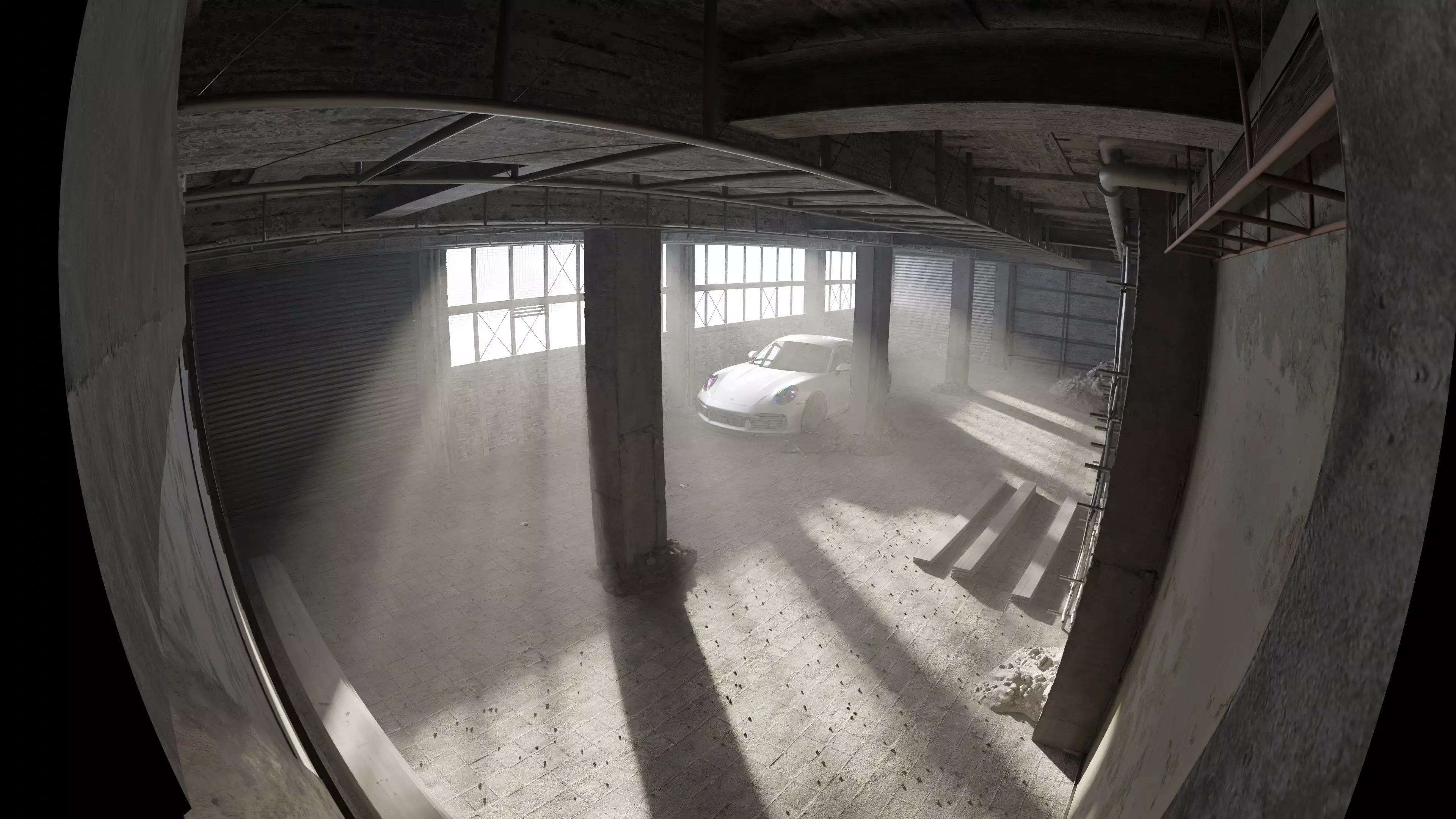 Old Worn Garage 3D Model. Modelled in Blender and added extra props from Bridge Quixel. The project is quite heavy with over 1.5 million polygons and can be achieved realism. The project has particle system of rocks on the floor which is hidden in viewport, so it will appear only in Blender and rendered with final resultI have prepared FBX, OBJ files with textures for other softwares but you will need to reconnect the textures and materials.The sun rays are made with Sun object in Blender or also can be done with HDRI textures|
