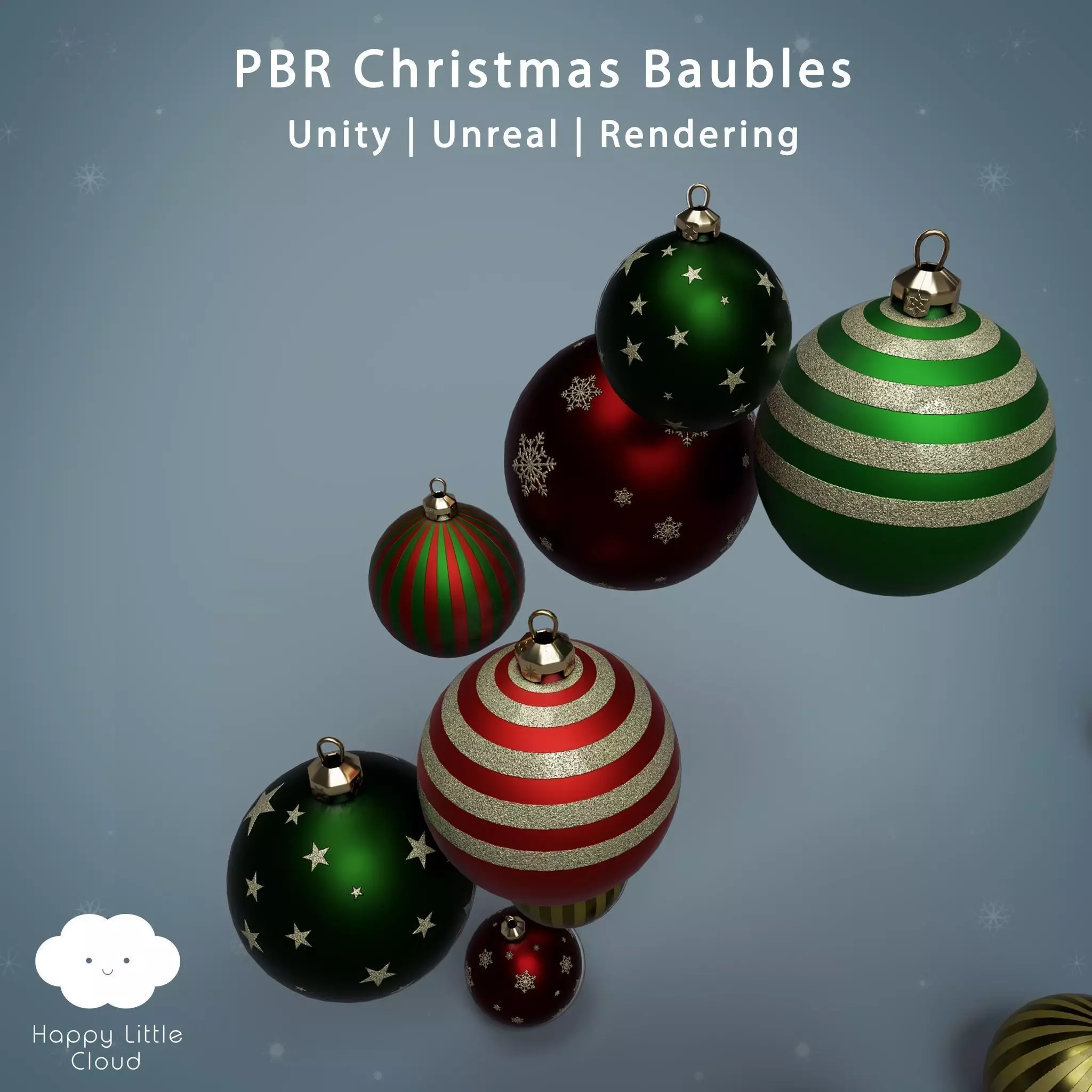 Christmas Bauble TexturesThis pack contains six different PBR texture sets for Unity, Unreal and PBR Rendering. All textures are in 2k resolution with appropriate maps for each set.Each model is fully unwrapped with no overlapping UVs.