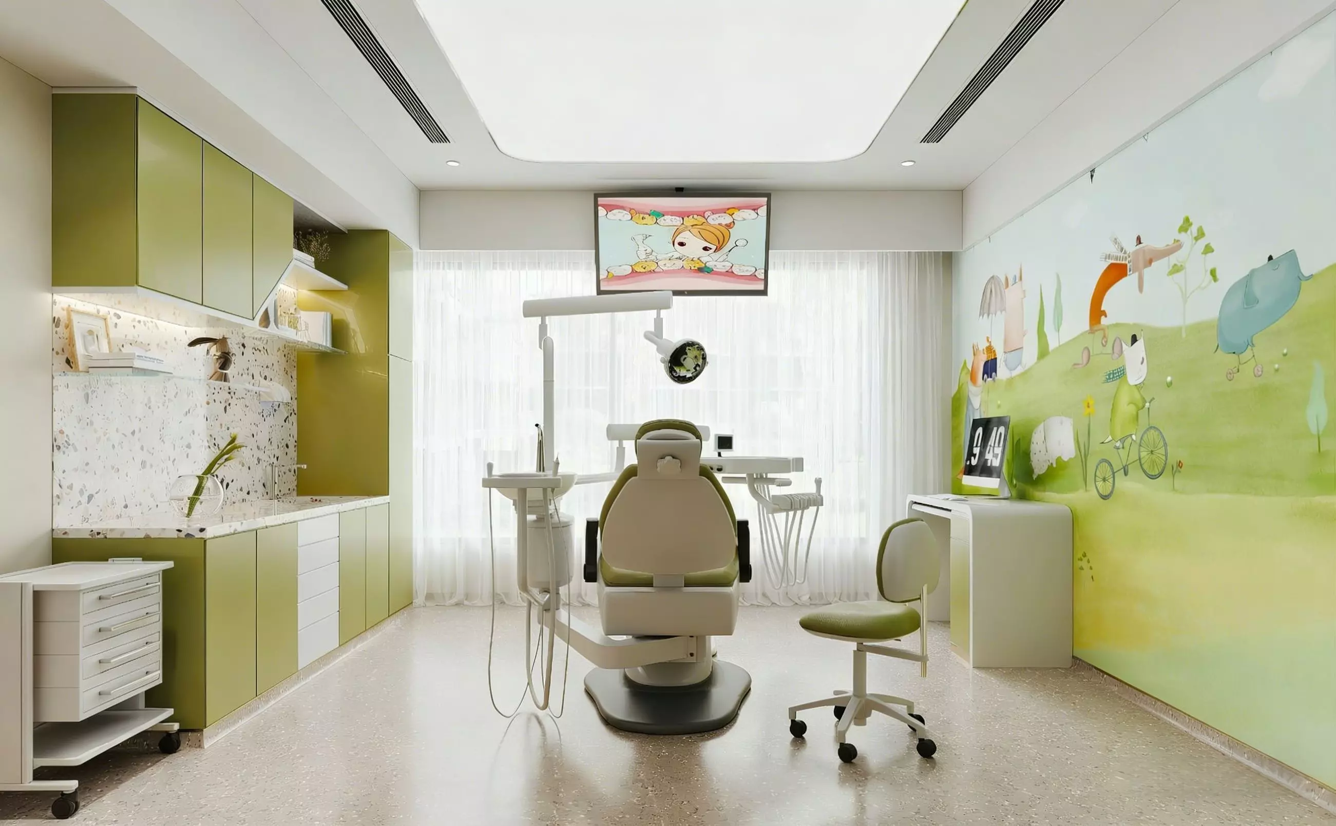 This is a child-friendly dental clinic featuring fresh, soft green and white as the main color palette, creating a relaxing and healing atmosphere that effectively eases children's anxiety during dental visits.The space is neatly and orderly arranged, with a professional dental chair at the center, equipped with comprehensive treatment devices. The walls are decorated with playful cartoon animals and natural scenes, paired with a screen playing cartoons to make the treatment process more engaging and fun.On the left, the olive-green cabinets with terrazzo countertops offer both practical storage and aesthetic appeal. Bright natural light filters through sheer white curtains, complemented by soft ceiling lighting, making the entire space bright and warm. It is a comfortable, safe, and playful oral treatment environment designed exclusively for children.