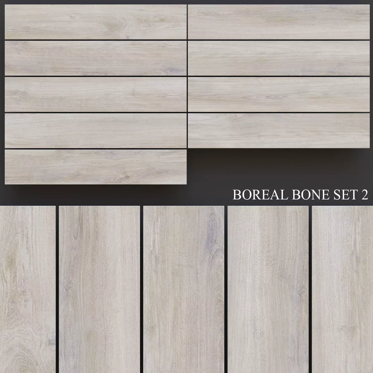 Presented 9 types of tilesBOREAL is a wood-effect tile collection that emulates knotless oak wood, with richly varying shades on each tile. A restful collection in a choice of four neutral colours, it comes in a 23x120cm format. Its Natural finish is available in all four colours (Bone, Sand, Walnut and Smoke)