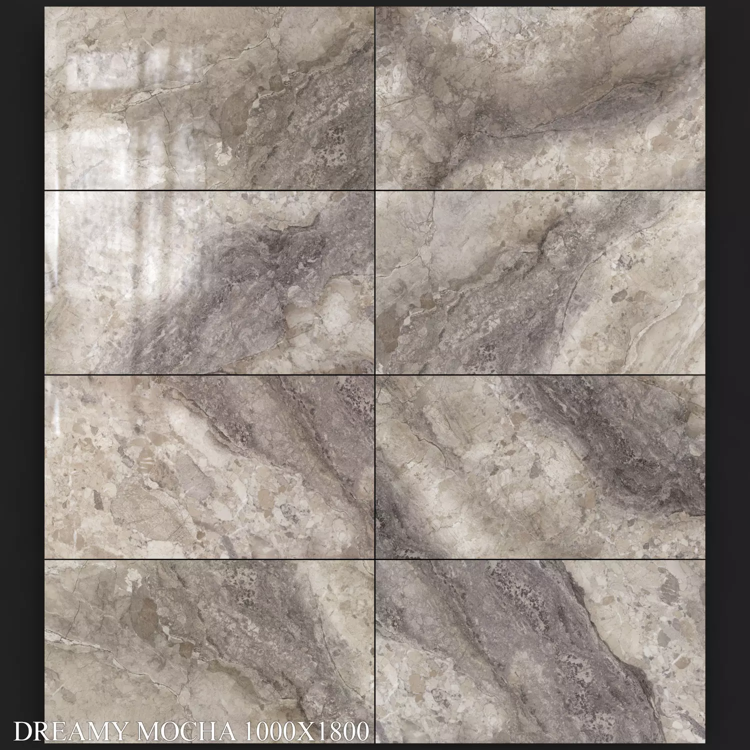 There are 8 types of tilesTexture resolution - 2000x1111Glossy surfaceDREAMY is a collection that conjures up images of the home of your dreams. It can be used in a wide variety of applications, with a personal twist as unique as each individual dream. The collection’s design is inspired by Illusion Bronze marble, further enhanced by clusters of stone, which lend its rich veined pattern a fascinating depth. DREAMY comes in two pale shades —Cloud, in a colder shade, and Desert, in a warmer one— and two darker colours with more shade variation —Road, in warm grey shades, and Mocha, in dark brown ones