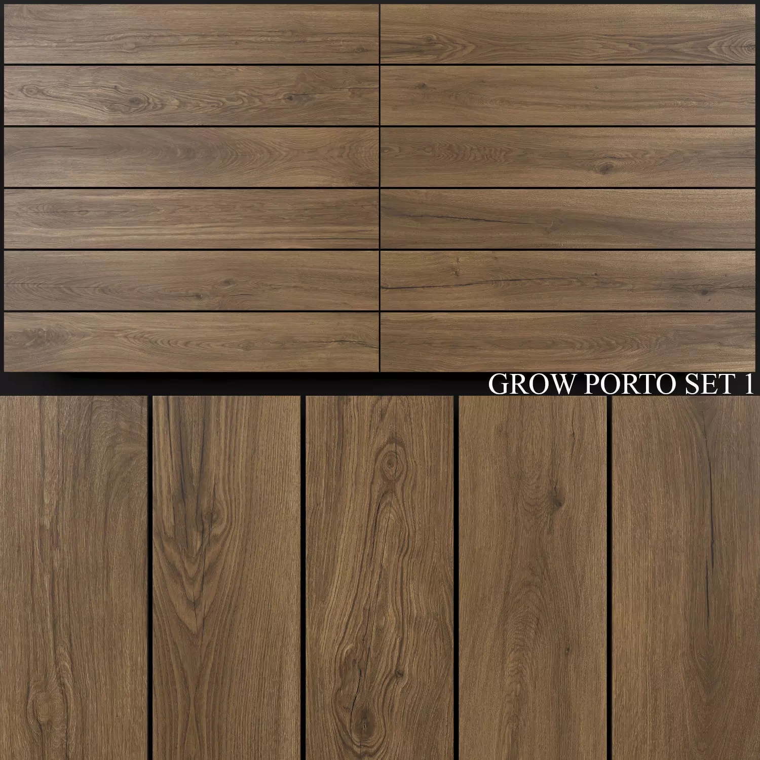 Presented 12 types of tilesTexture resolution - 1998x339Grow encapsulates all the beauty of oak wood in a collection brimming with personality, conspicuous for its unique, exquisite looking knots. With its 24x151cm format and Shaped finish, the collection has a chic, modern appeal. Available in a choice of seven colours, including five warm shades (Maple, Taupe, Honey, Kalua and Porto) and two more neutral-looking ones (White and Dolphin), the collection guarantees broad visual potential