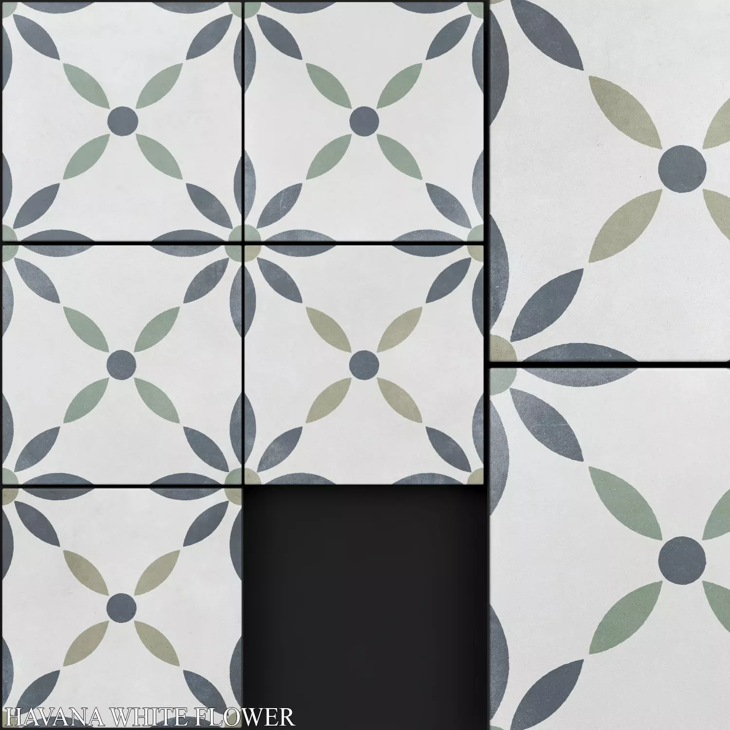 Presented 5 types of tilesThis new collection, inspired by traditional cement tiles, takes its name from the capital of the island of Cuba, where these tiles were traditionally used in many buildings. HAVANA comes in a 22.3x22.3cm format in different shades of white, grey, blue and green, with geometrical shapes or other motifs that can be combined to create continuous patterns. A new vision of cement tiles, with a myriad of subtle nuances.