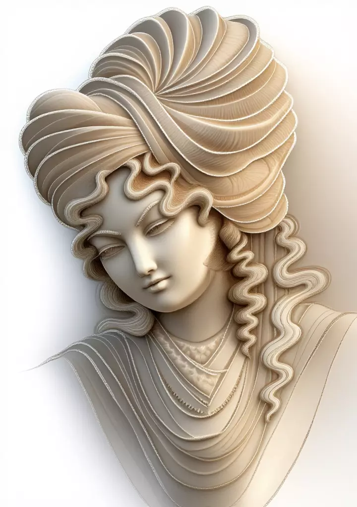 This exquisite bas-relief artwork delicately portrays the visage of a dignified woman. In creating this piece, the artist drew inspiration from Persian miniature paintings, employing soft, fluid lines in the design of her face and attire to evoke a sense of tranquility and grace in the viewer. The intricate hairstyle and magnificent headdress seem to borrow from the visual subtleties and imaginative motifs of authentic Persian miniatures, narrating a tale of ancient civilizations and mythological goddesses.
