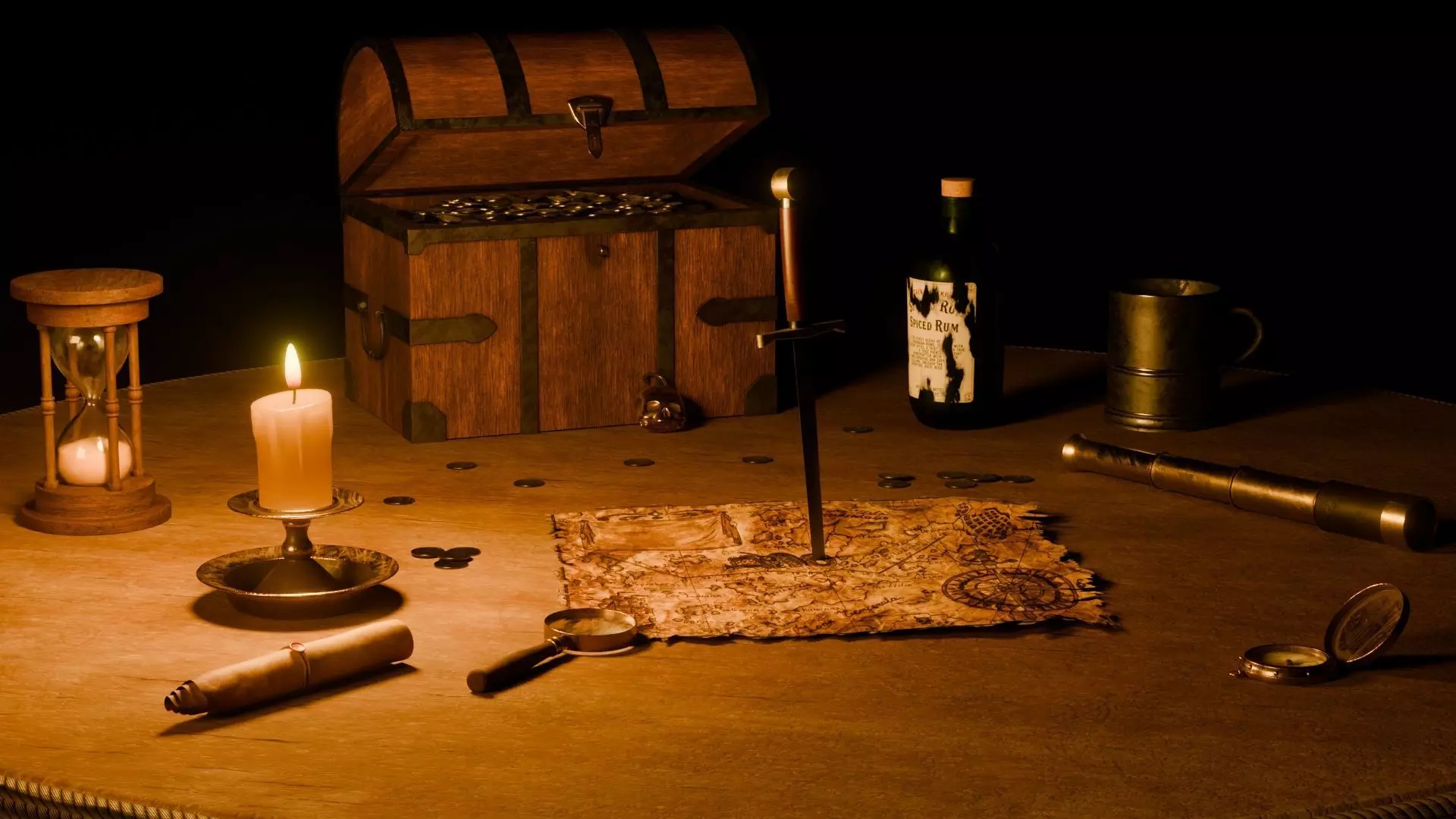 Step into a world of adventure with this pirate-themed table scene, perfect for renders, animations, or concept art projects.The scene features a warmly lit table filled with classic pirate props — a treasure map, chest full of gold, bottle of rum, hourglass, spyglass, dagger, and many more details that bring the environment to life with a cinematic touch.