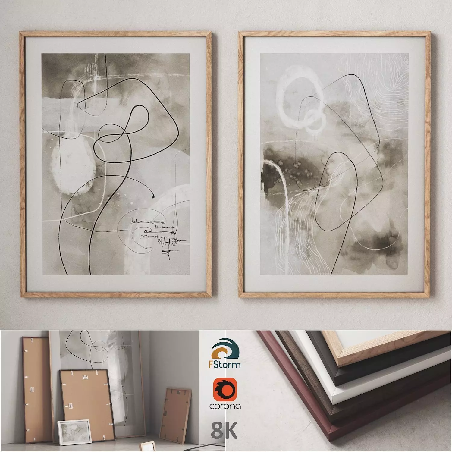 Two matching posters of illustrations with abstract shapes and lines in white and black on a beige watercolor background.