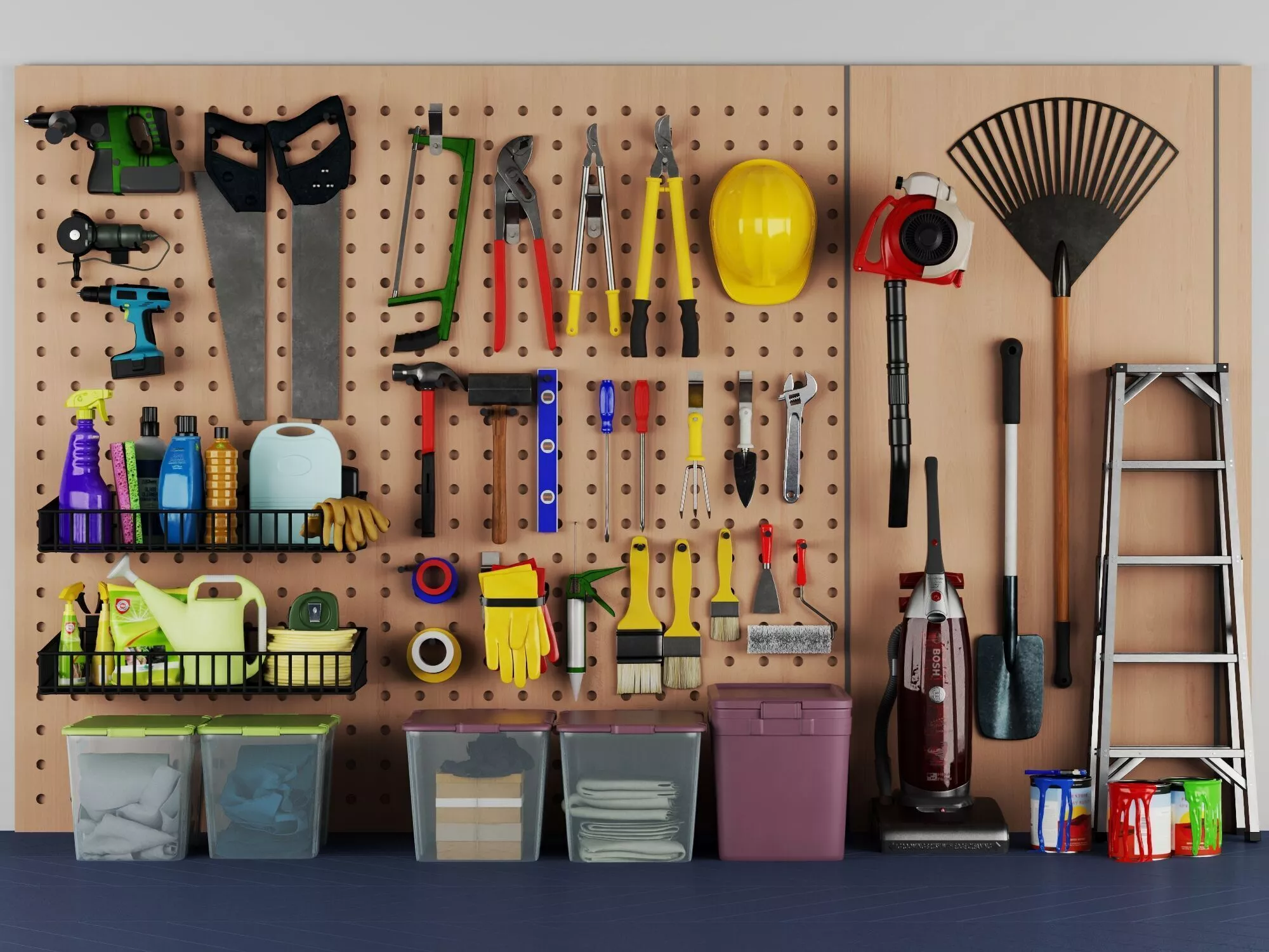 Professional high-quality 3D Mega Collection of Workshop Tools and Maintenance Equipment meticulously crafted for premium garage visualization industrial studio planning and hardware retail projects. This comprehensive asset features a massive modular pegboard system organized with high-fidelity power drills hand saws pneumatic blowers professional vacuum cleaners aluminum ladders heavy-duty storage bins and a vast array of manual tools including hammers wrenches pliers and screwdrivers alongside realistic cleaning chemicals.