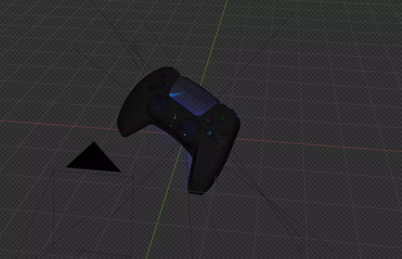 PS5 controller with two joysticks, rendered in a futuristic and luminous style. The controller is adorned with red textured patterns that blend with an electric blue glow. Neon lighting outlines the edges, highlighting the ergonomic shape of the controller. The iconic PlayStation buttons (Triangle, Circle, Cross, Square) are also backlit, creating a striking contrast against the dark background. The glossy finish of the controller, combined with the glowing reflections, gives it an almost holographic appearance, evoking a sci-fi aesthetic. The overall design emphasizes both sleekness and modern technology