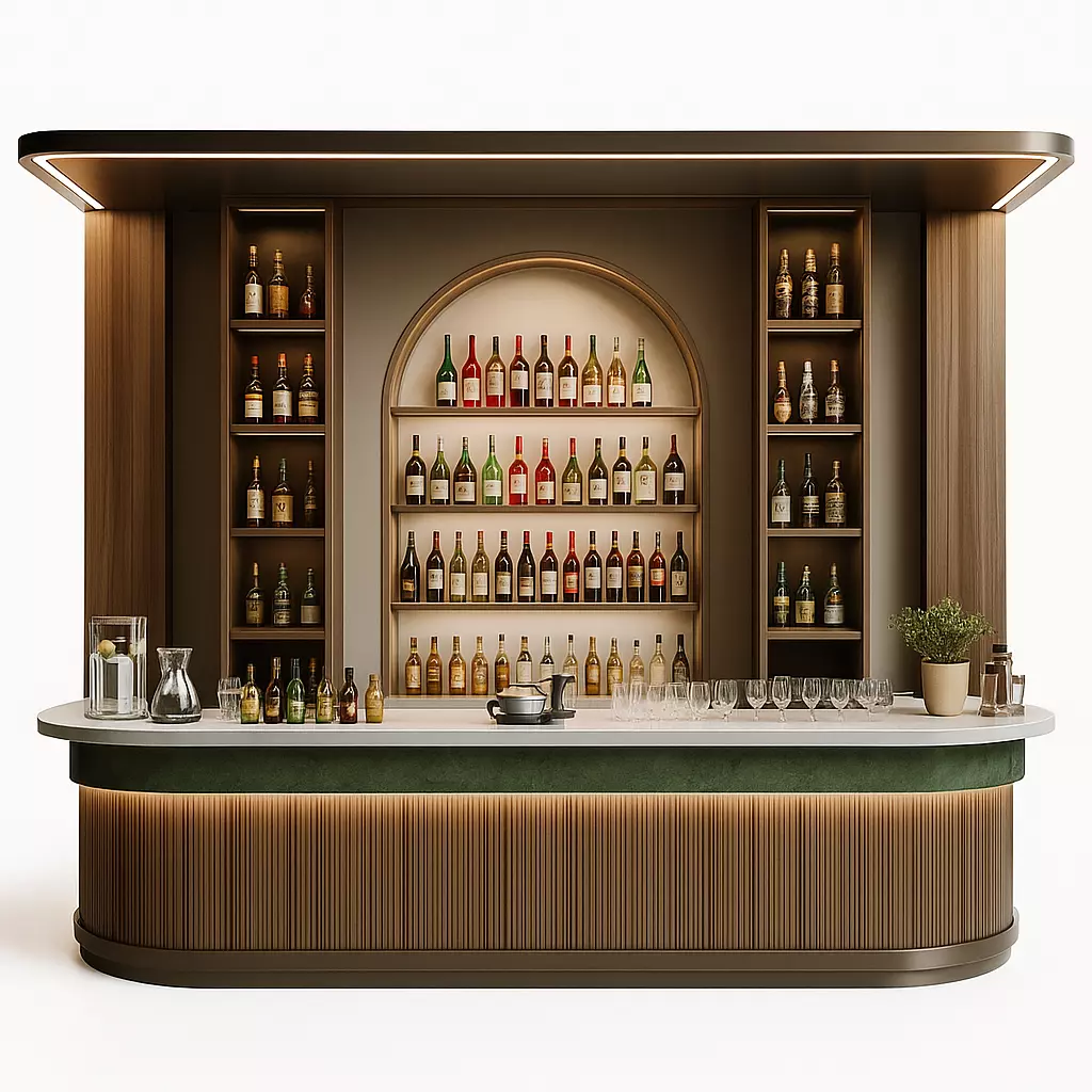 Shape: Wide rectangular counter with rounded edges.Surface: Smooth white countertop with glassware, pitchers, coffee machine, and bottles placed neatly.Front Panel: Vertical wooden slats with integrated warm LED strip lighting.Accent: Green marble/stone strip runs along the front, adding elegance.