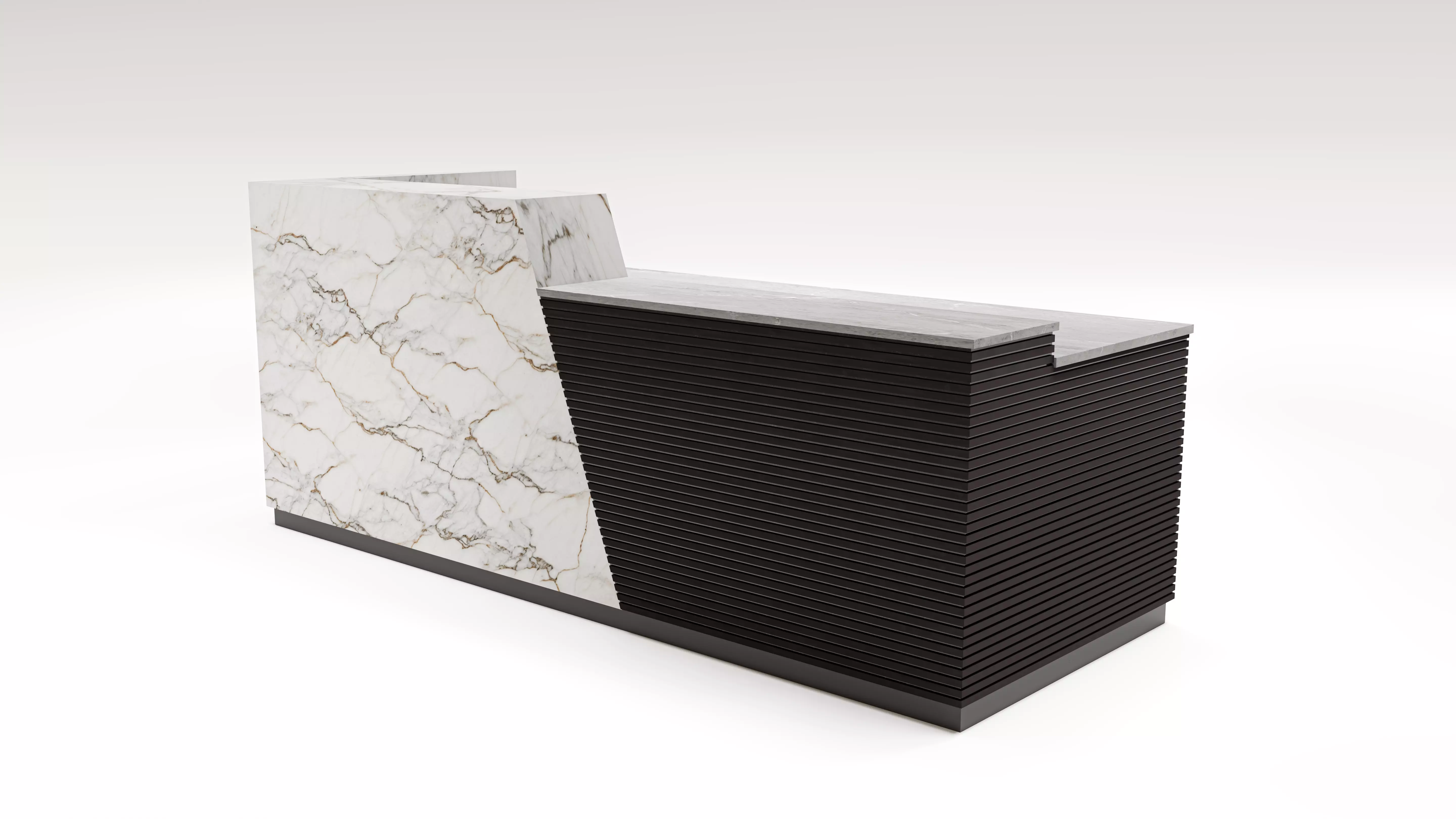 Modern reception desk with a minimalist, high-end design. The model features a contrasting combination of light marble panels and dark horizontal slatted surfaces, creating a clean and elegant look. Perfect for contemporary offices, hotels, showrooms, or commercial interiors.