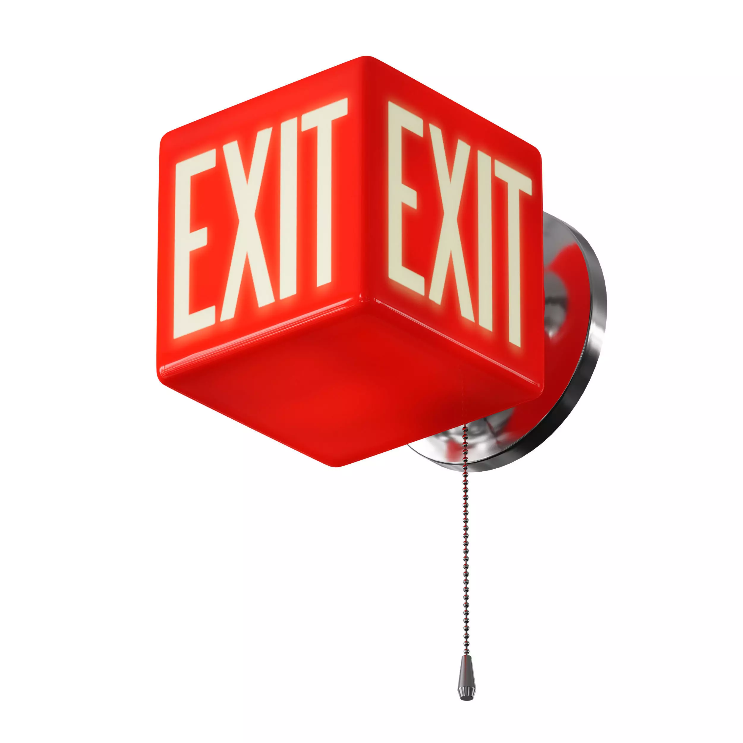 3D model of a wall lamp in the form of a red glowing cube with a glowing inscription EXIT. The base is round chromed, there is a switch chain. Can be used as a technical light source or as a decorative element.