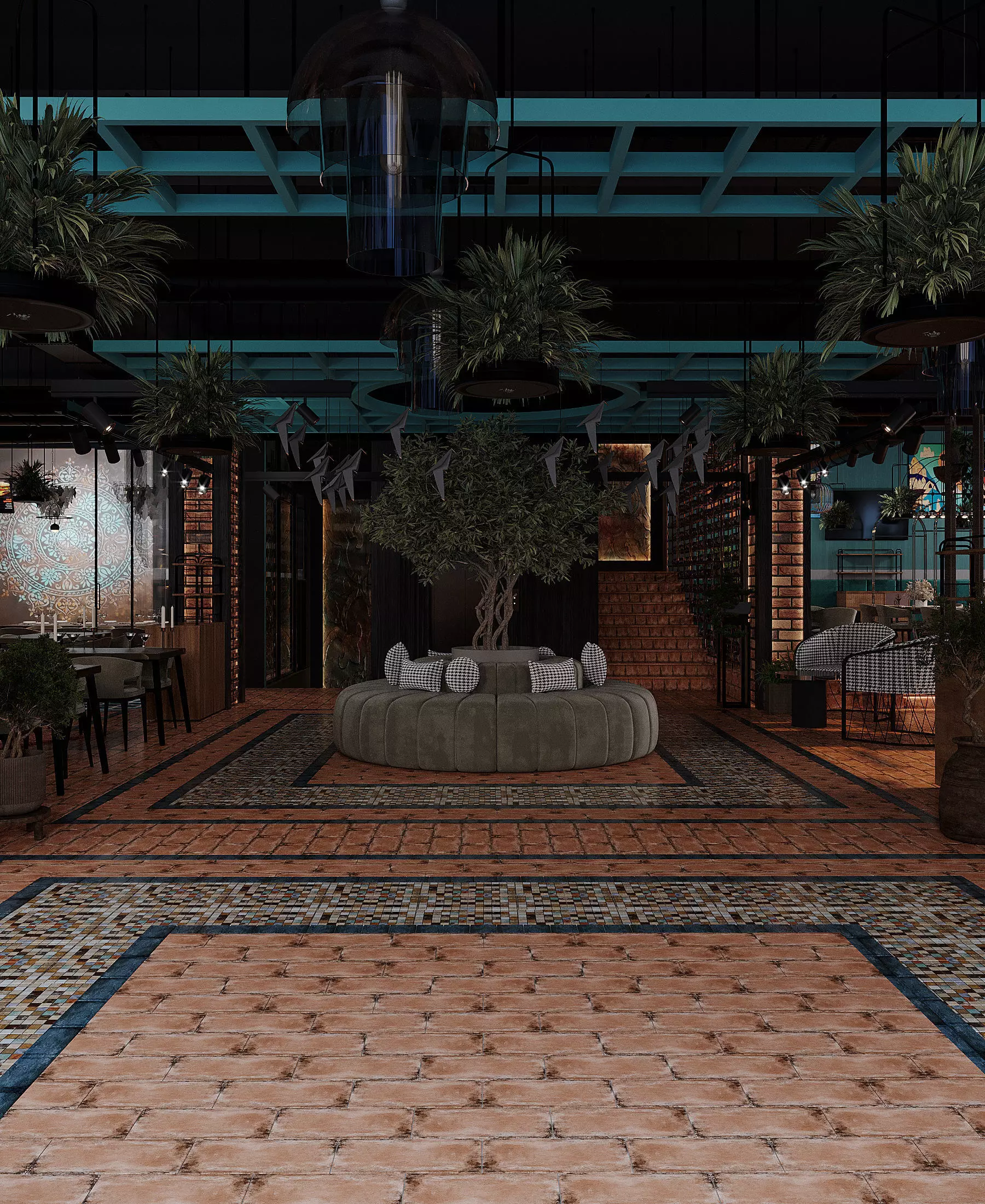 Lighting plays a key role in defining the restaurant’s identity. Ambient lighting creates a warm and inviting mood, while accent lights highlight tables, textures, and architectural elements. This layered lighting approach strengthens the overall atmosphere and enhances the dining experience.