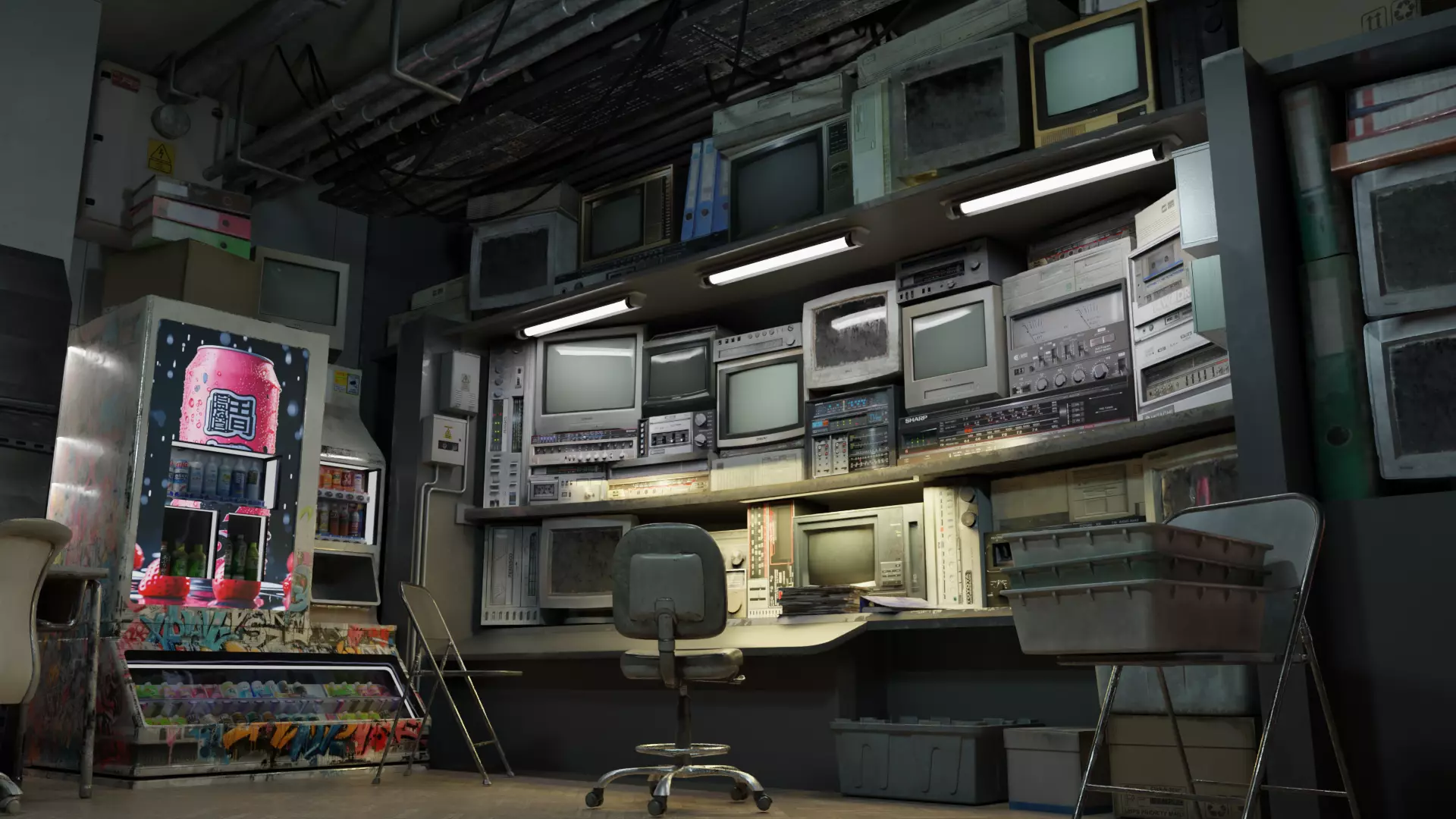 Step into a detailed and atmospheric retro-futuristic workshop, perfectly designed for Blender users. This environment captures the essence of a cluttered, cyberpunk repair shop or hideout, featuring vintage CRT monitors, vending machines, and industrial elements. Ideal for concept art, cinematic renders, or storytelling projects.