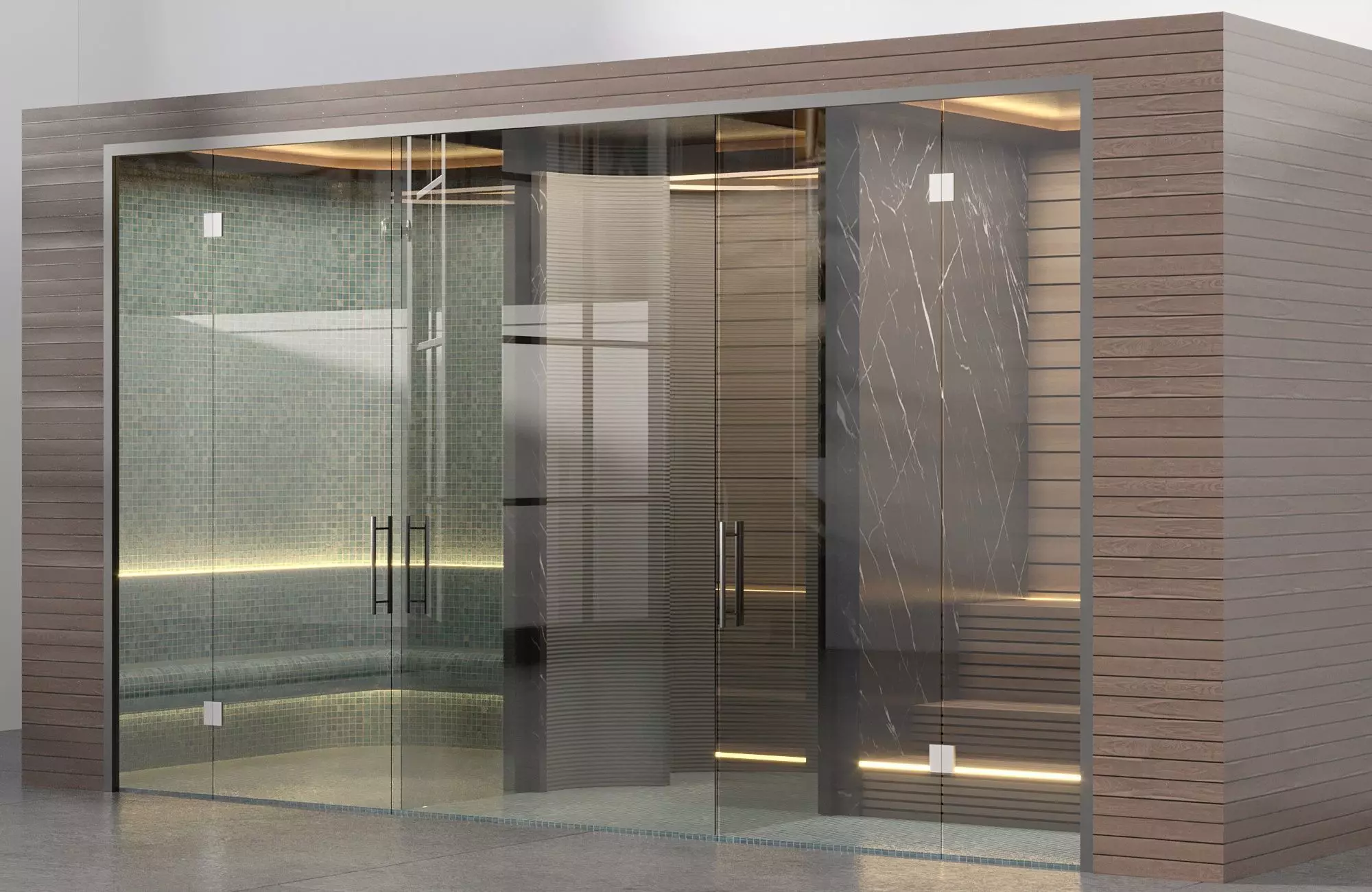 Dry Sauna (right) wooden interior with warm lighting and traditional sauna seating.Steam Room (left) mosaic-tiled walls with built-in seating, illuminated with hidden LED strips.Shower Area (center) minimalist design with neutral stone tiles, positioned between sauna and steam room for convenient access.