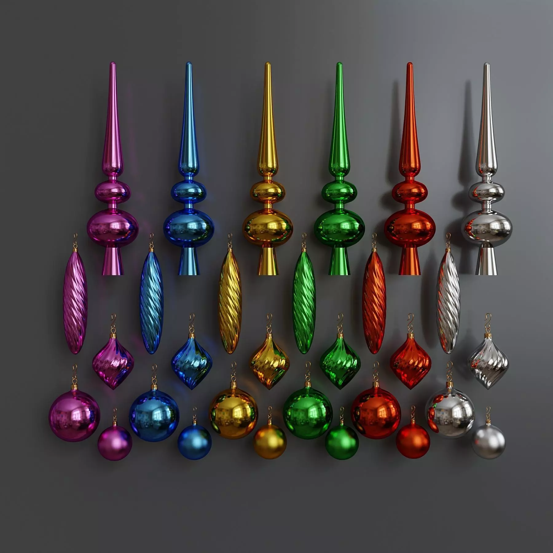 Set of multi-colored Christmas toys. The set contains 30 items in six different colors. All toys (except the top) have a hook for hanging on a Christmas tree (hooks and toys are combined into one single mesh). Textures were not used in the models.