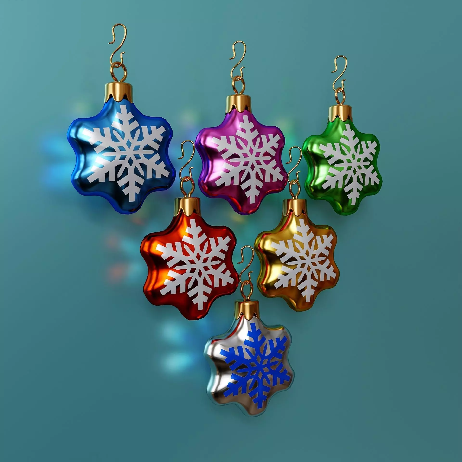 A set of shiny multi-colored (6 colors) Christmas toys with hooks. (hooks with a toy are combined into one solid object. (six toys - six objects)) The texture (snowflake) is packed into a zip archive.