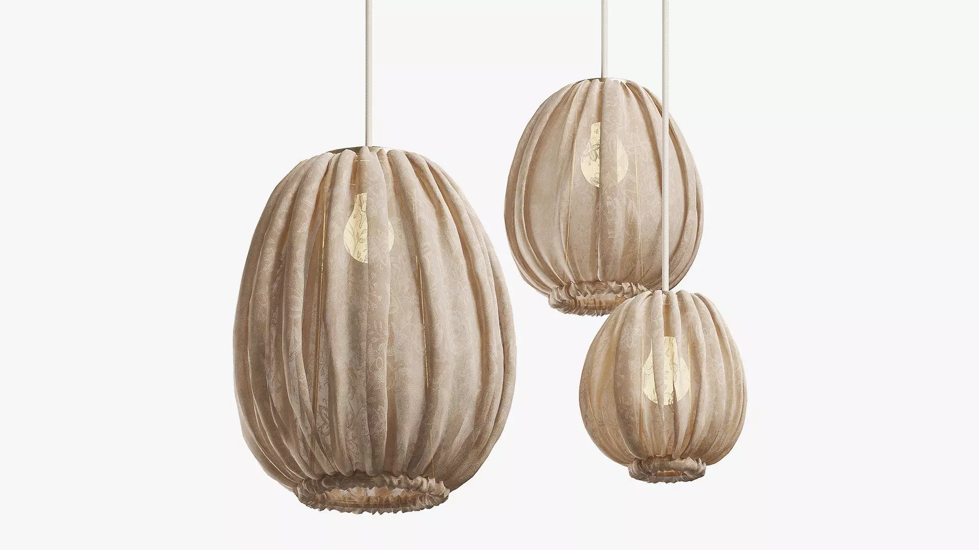 Set of three pendant lamps of different sizes. Translucent fabric lets light through. Braided cord, brass base. Fabric: light floral pattern in beige. The scene features three variations of lamps (dimensions are in millimeters):