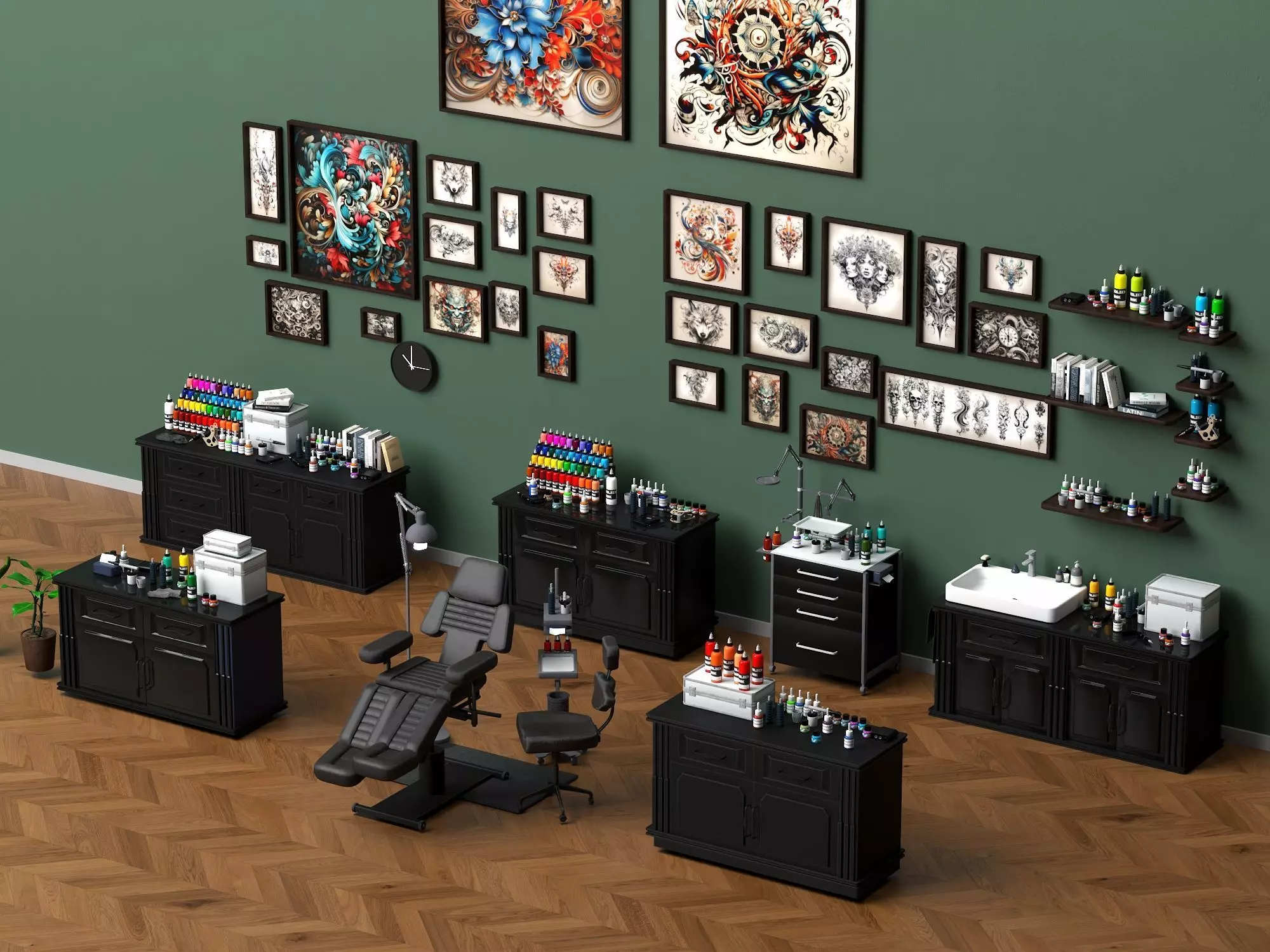 High-quality realistic 3D model of a complete modern tattoo studio interior setup. This professional workspace features a dark green accent wall with framed colorful tattoo artworks, adjustable black leather reclining tattoo chair with footrest, multiple black wooden cabinets and workstations stocked with ink bottles (vibrant rainbow colors), tattoo machines, needles, power supplies, sinks with faucets, printer for stencils, wall-mounted shelves displaying art prints and supplies, large floor lamp, potted plants, and herringbone wooden flooring.Clean topology, high-resolution PBR textures for photorealistic renders. Ideal for architectural visualization, tattoo parlor design, beauty/salon interiors, commercial space projects, VR/AR studio tours, animations, game environments, and product mockups.Modeled in 3ds Max with V-Ray rendering – ready to render as shown. Modular elements for easy customization and scene building.Export formats: .fbx, .obj, .blend (Blender native), plus native 3ds Max project file for full editing. All textures packed separately.