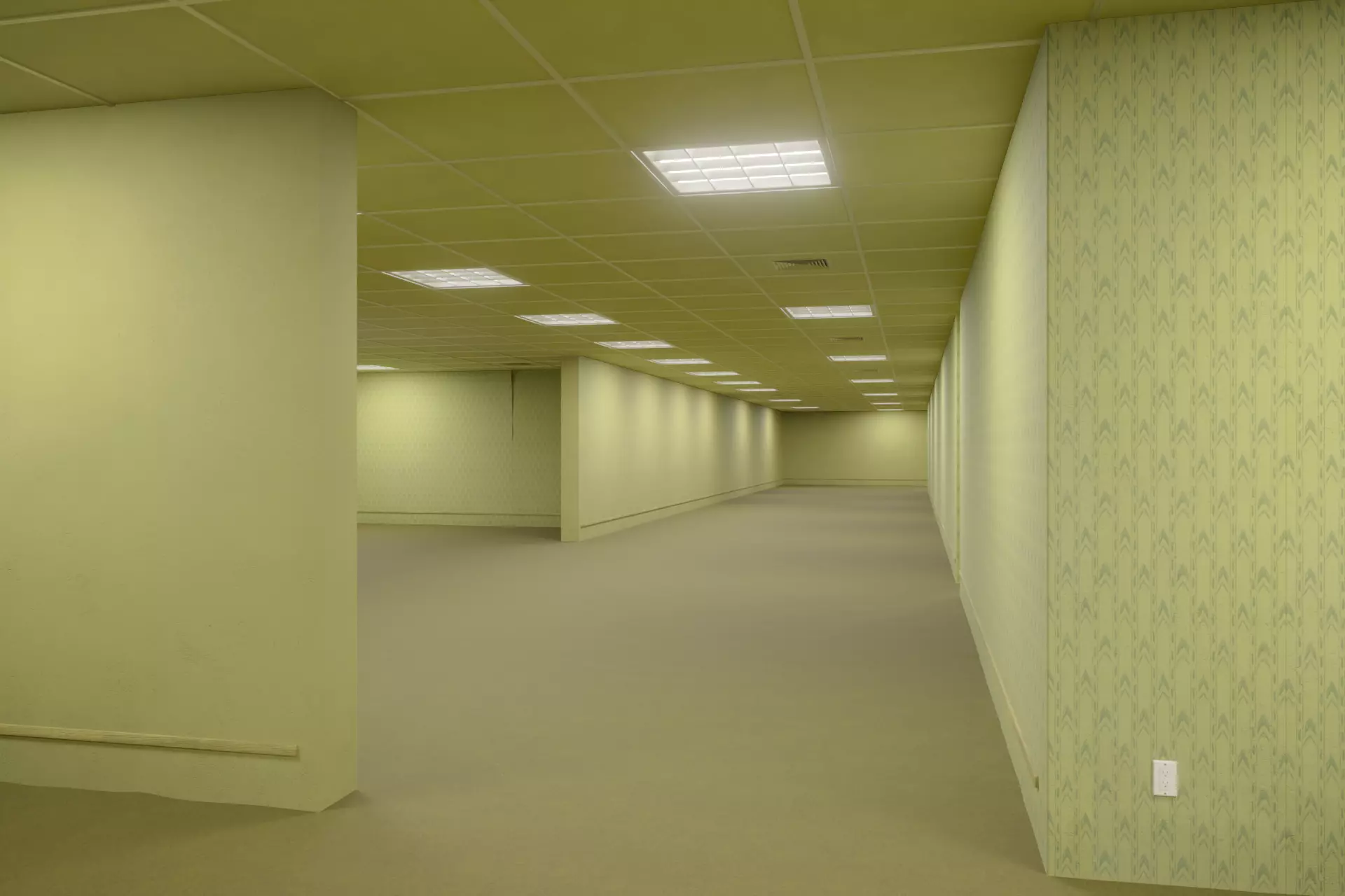 A simple modular interior environment based on the original Backrooms photograph modeled using Blender. The wall textures have been taken directly from a hi-res version of the image. Textures are in 4K resolution for walls and 2k resolution for smaller assets. Preview images have been rendered using Cycles renderer.