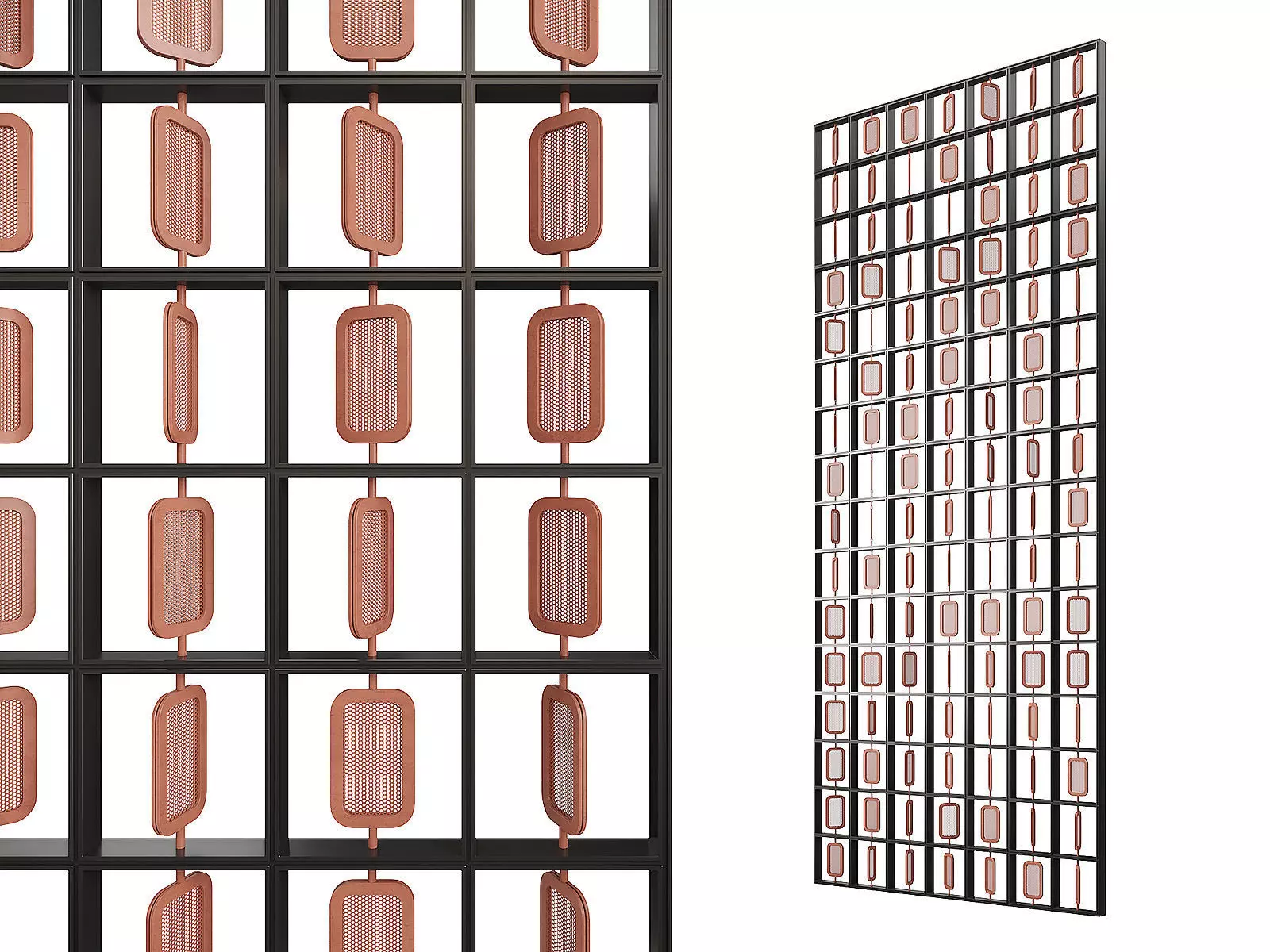 The black metal outer frame is filled with orange painted perforated metal moving panels. By changing the angle of rotation of the mini-panels, you can change the level of illumination in the zoned spaces.