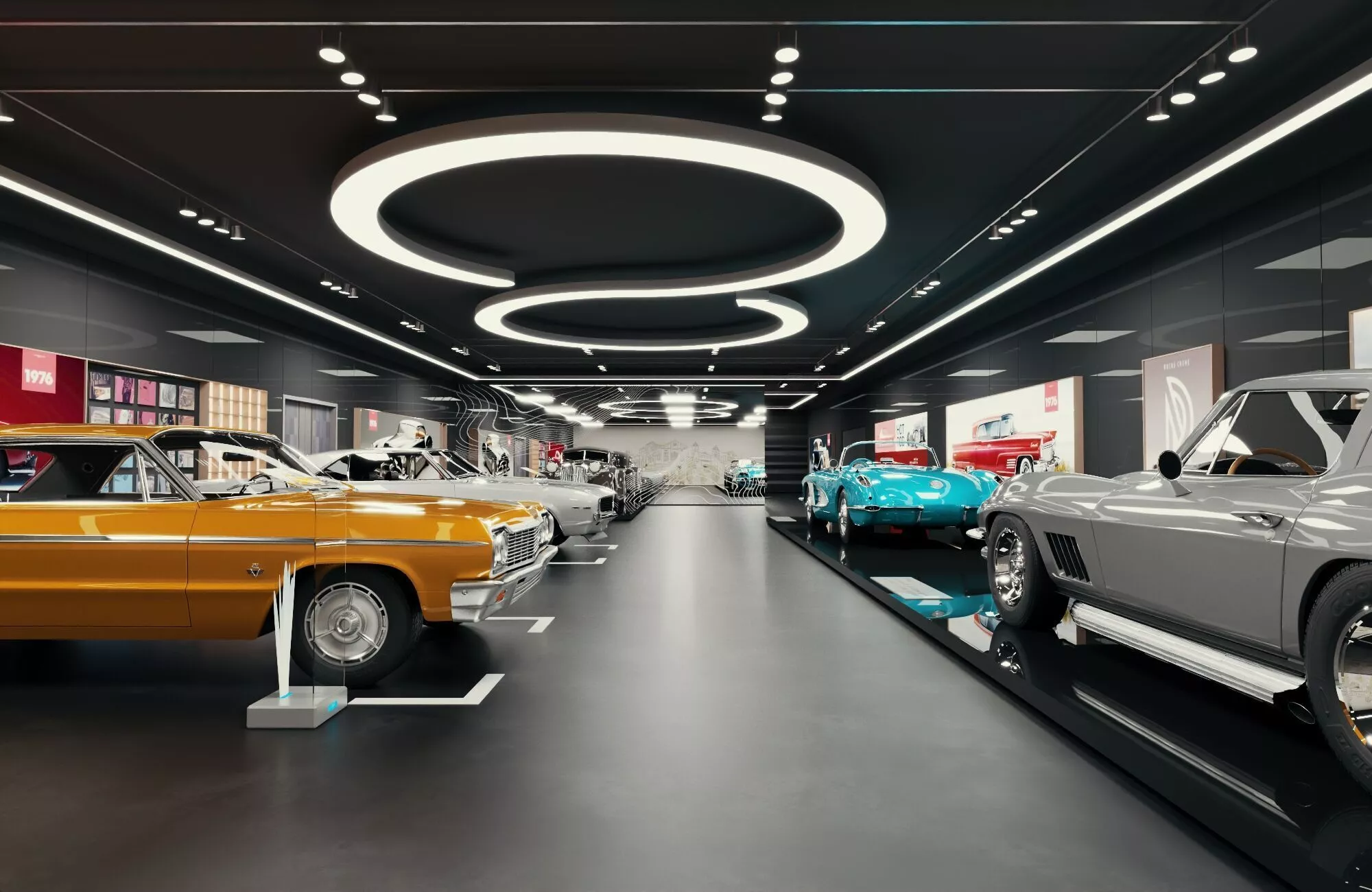 Professional high-quality 3D complete scene of a Luxury Classic Car Museum meticulously crafted for premium automotive visualization and architectural projects. This comprehensive asset features a sophisticated exhibition space including multiple high-fidelity classic American muscle cars and vintage roadsters professional circular LED ceiling installations interactive display walls with historical posters and high-gloss showroom flooring designed for realistic reflections.