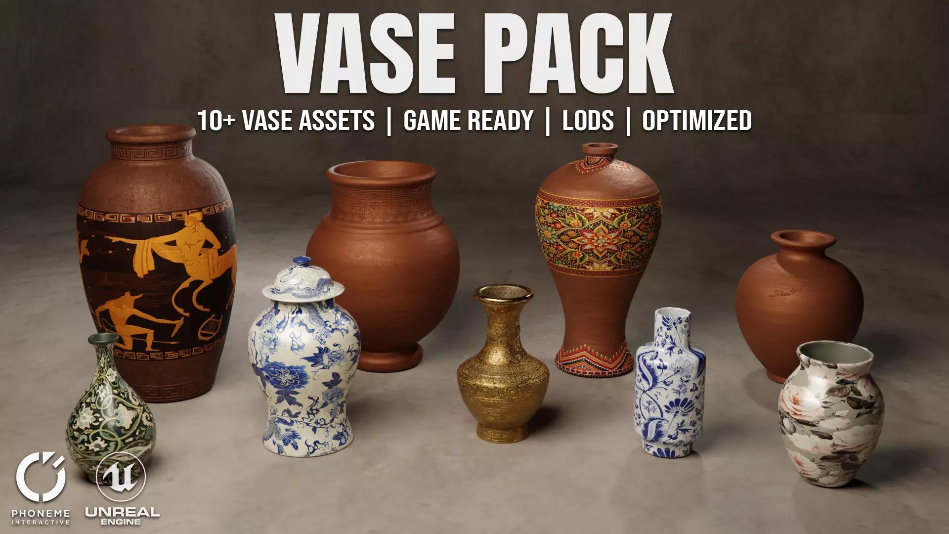 Each vase is game-ready and optimized with clean topology, three LOD levels, and high-resolution PBR textures. Designed for Unreal Engine but compatible with all major game engines, this pack is ideal for museum environments, ancient-themed scenes, or high-end interior visualizations.