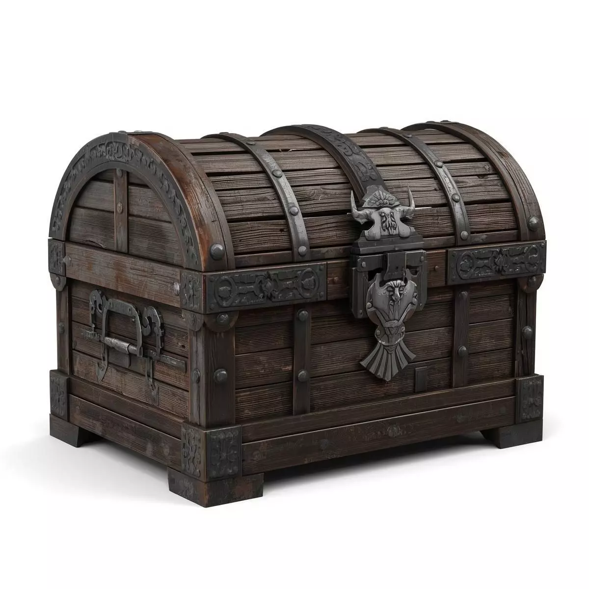 The model showcases a heavy, domed-top wooden chest structure reinforced with thick, hand-forged iron bands and ornate corner brackets.