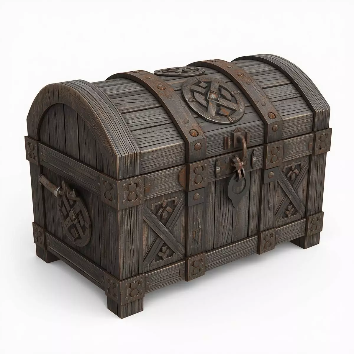 The model showcases a heavy, domed-top wooden chest structure reinforced with thick, hand-forged iron bands and ornate corner brackets.