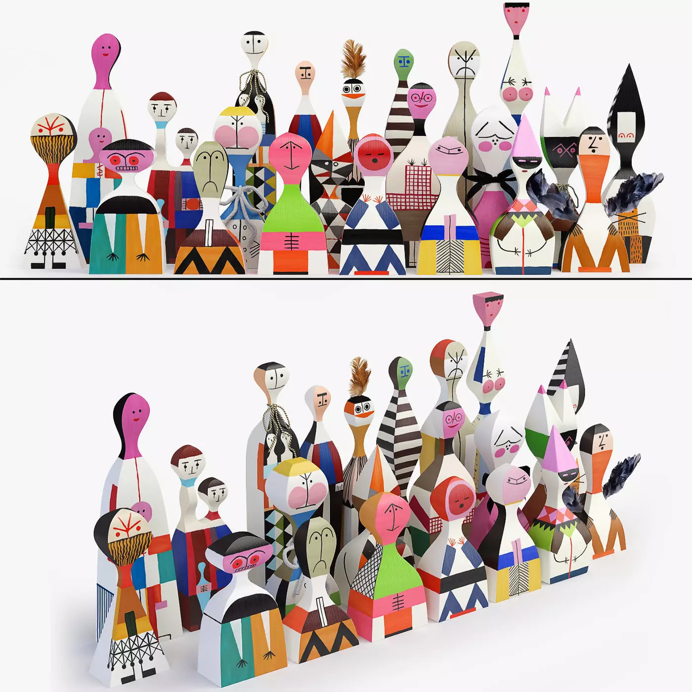 Alongside Charles and Ray Eames as well as George Nelson, Alexander Girard was one of the decisive figures in post-War American design. The focus of his broad oeuvre was on textile design, and a key source of inspiration for him was his passion for the popular art of South America, Asia and East Europe. The Wooden Dolls, which Girard created in 1963 for his own home in Santa Fe and made himself, are likewiseinspired by his own extensive collection of works of popular art. Half decorative element, half toy, the Wooden Dolls were originally intended only for personal use. Based on originals found in the Girard Estate held by the Vitra Design Museum, the partly joyful, partly grim-looking company of dolls is now available as a charming enhancement to any interior.