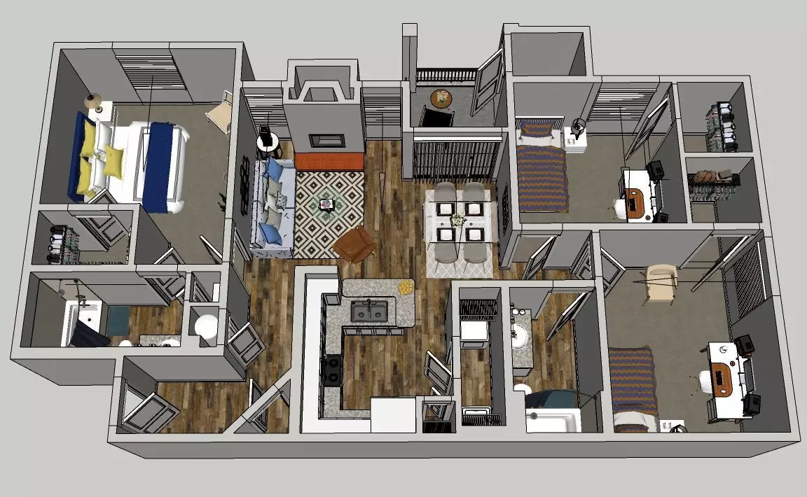 High detailed floor plan model with Vray For Sketchup 5 materials. Its created via Sketchup 2021 but you can find 2017 version seperately for earlier versions of Sketchup. (2017 - 2021) The model include 2 bathrooms, 3 bedrooms, 1 kitchen and 1 living room with full furnitures.FBX file included for converting to other applications. All textures included some of them are PBR (4K-8K textures). All components has been choosen as high poly models which give you the best result on even closer camera angles. You might use the furniture models seperately for your other scenes as much as the textures.