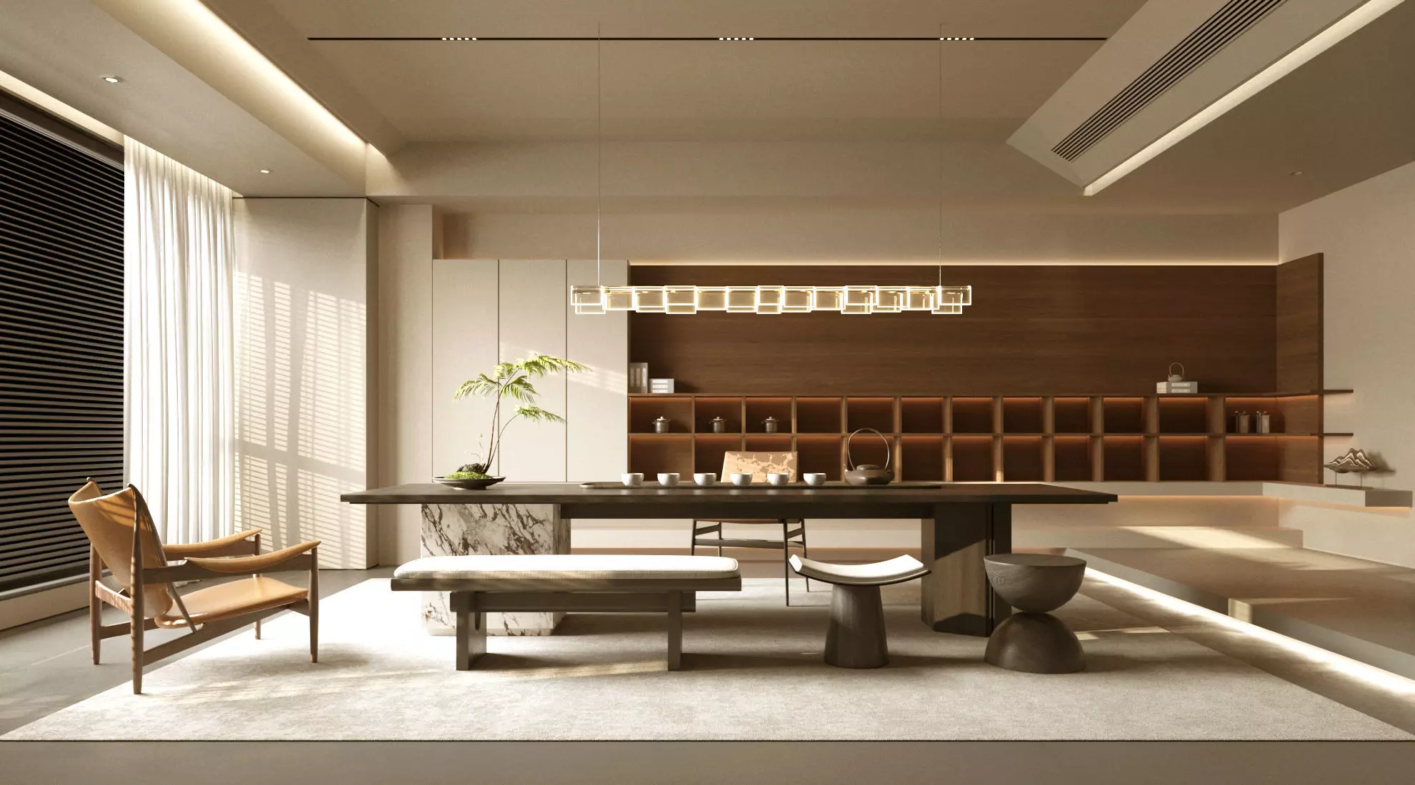 The picture shows a wabi - sabi style teahouse. The space is dominated by soft earth tones, creating a quiet and simple atmosphere. The long table has a simple shape, combined with wood and stone elements. Tea sets and green plants are placed on the table, fully showing the natural authenticity. The surrounding chairs and low stools have a simple design, retaining the original texture of the materials. The wooden shelf on the background wall displays tea sets and other items in an orderly manner. The long strip chandelier above has neat lines and soft light. The whole space is not over - decorated. Through natural materials and simple layout, it conveys the charm of incompleteness, simplicity and nature in wabi - sabi aesthetics, giving people a quiet and relaxing tea - tasting experience.