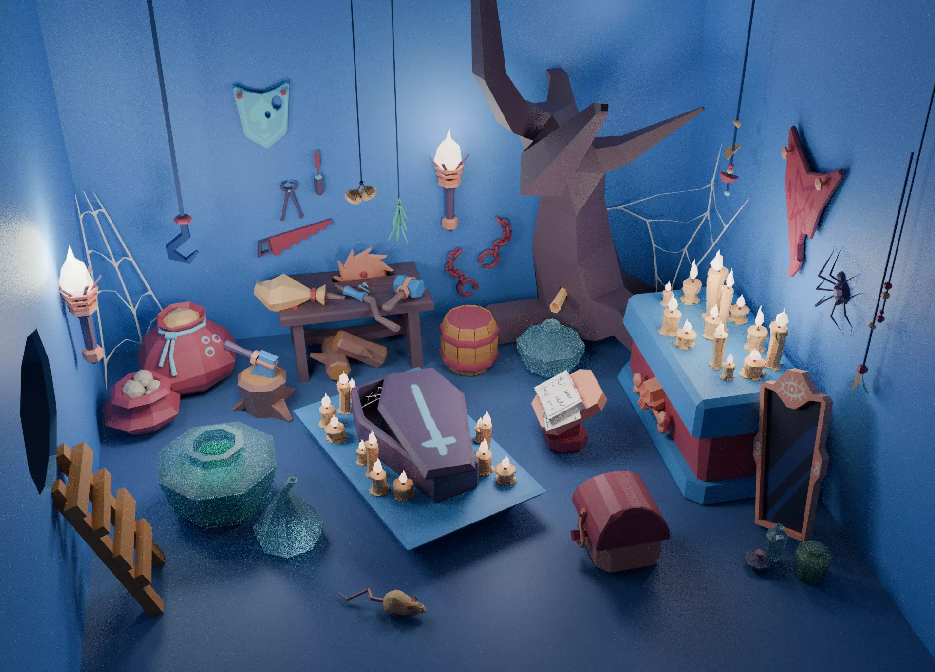 A cozy hand-painted low-poly asset pack featuring 44 witch basement props. Perfect for fantasy, magical, horror environments.