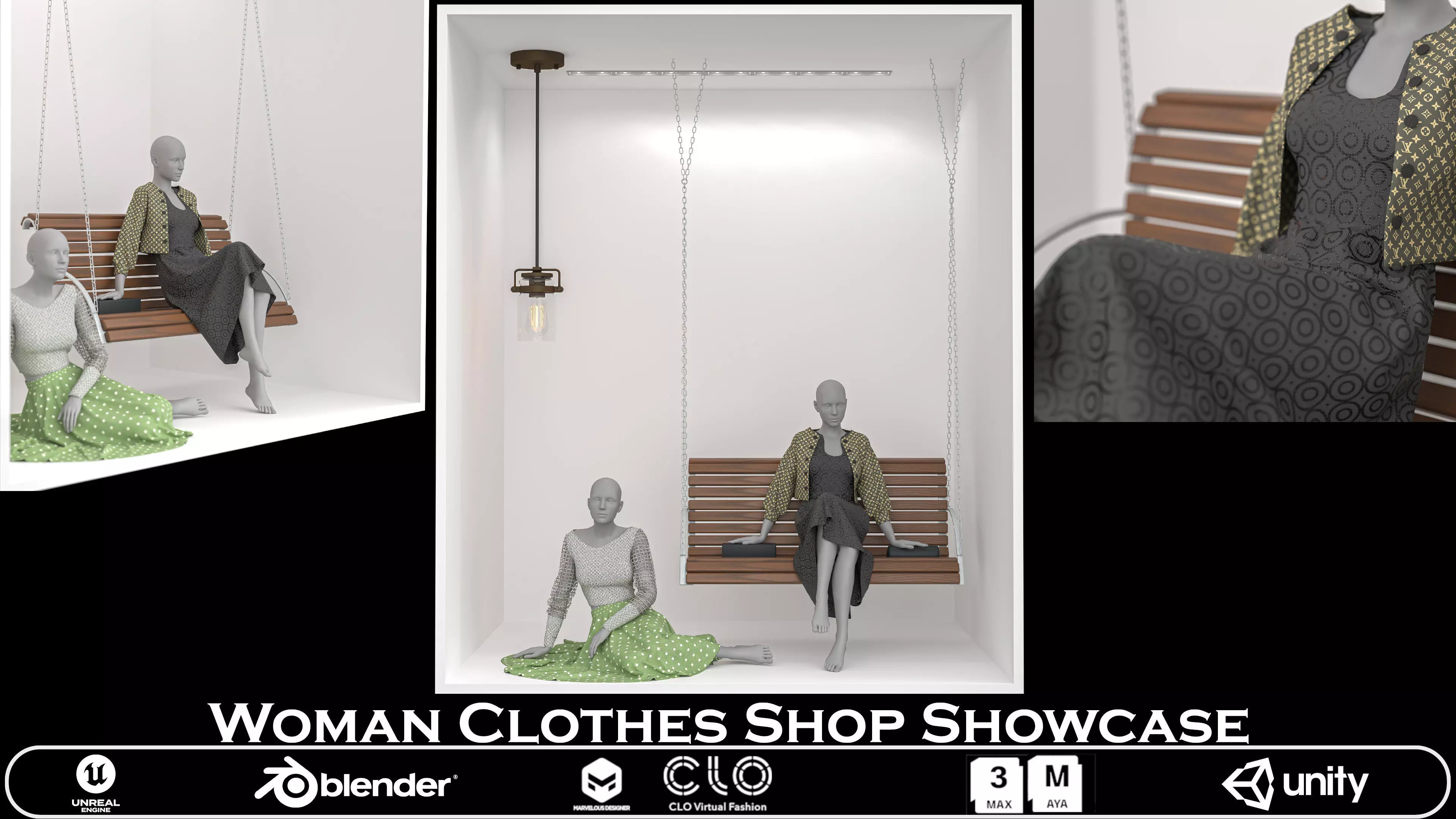 This is a high-quality 3D model of a women’s clothes shop showcase, designed with attention to fashion presentation and interior styling. It features two mannequins wearing realistic cloth garments, posed in a minimal modern display box with props like a wooden swing bench and ceiling light.