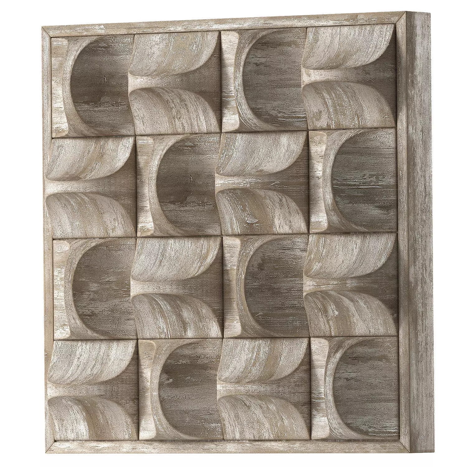 A modern interpretation of wood decor, this convex wall panel features three-dimensional relief pine blocks with an aged natural stain and ivory accents.