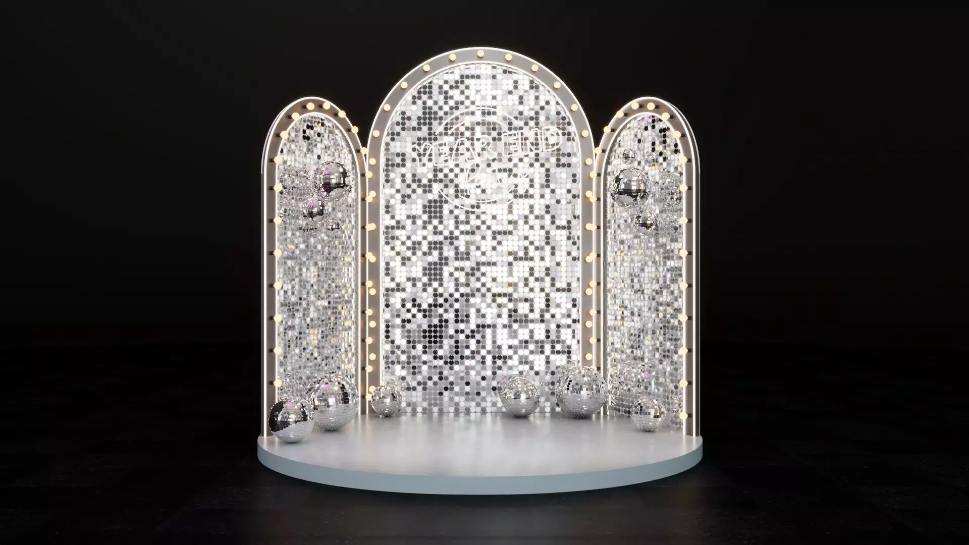 Stunning Sequin Texture: Features a realistic silver shimmer wall / sequin panel effect that catches light beautifully.Festive Props: Includes highly detailed disco balls (mirror balls) in various sizes scattered across the floor and suspended in the air.Lighting Elements: Classic marquee light bulbs line the triple-arch structure, adding a warm, premium feel.Versatile Design: The Year End Party text can be easily removed or replaced for other events like Weddings, Galas, Awards Nights, or Fashion Shows.Ready to Render: Materials and textures are set up for photorealistic results (mention your renderer here, e.g., V-Ray 7