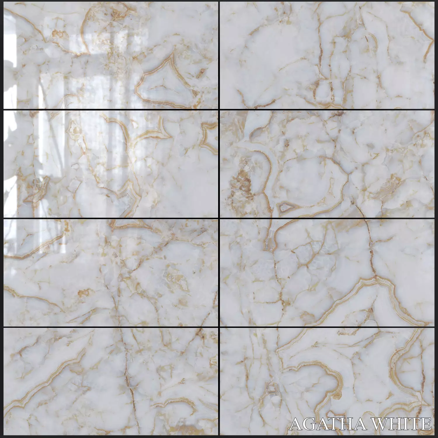 8 types of tiles are presentedGlossy surfaceAgatha series presents the of gold ornaments infused into natural onyx marble design with 60x120 size to create an elegant look with three different color alternatives on polished finish.