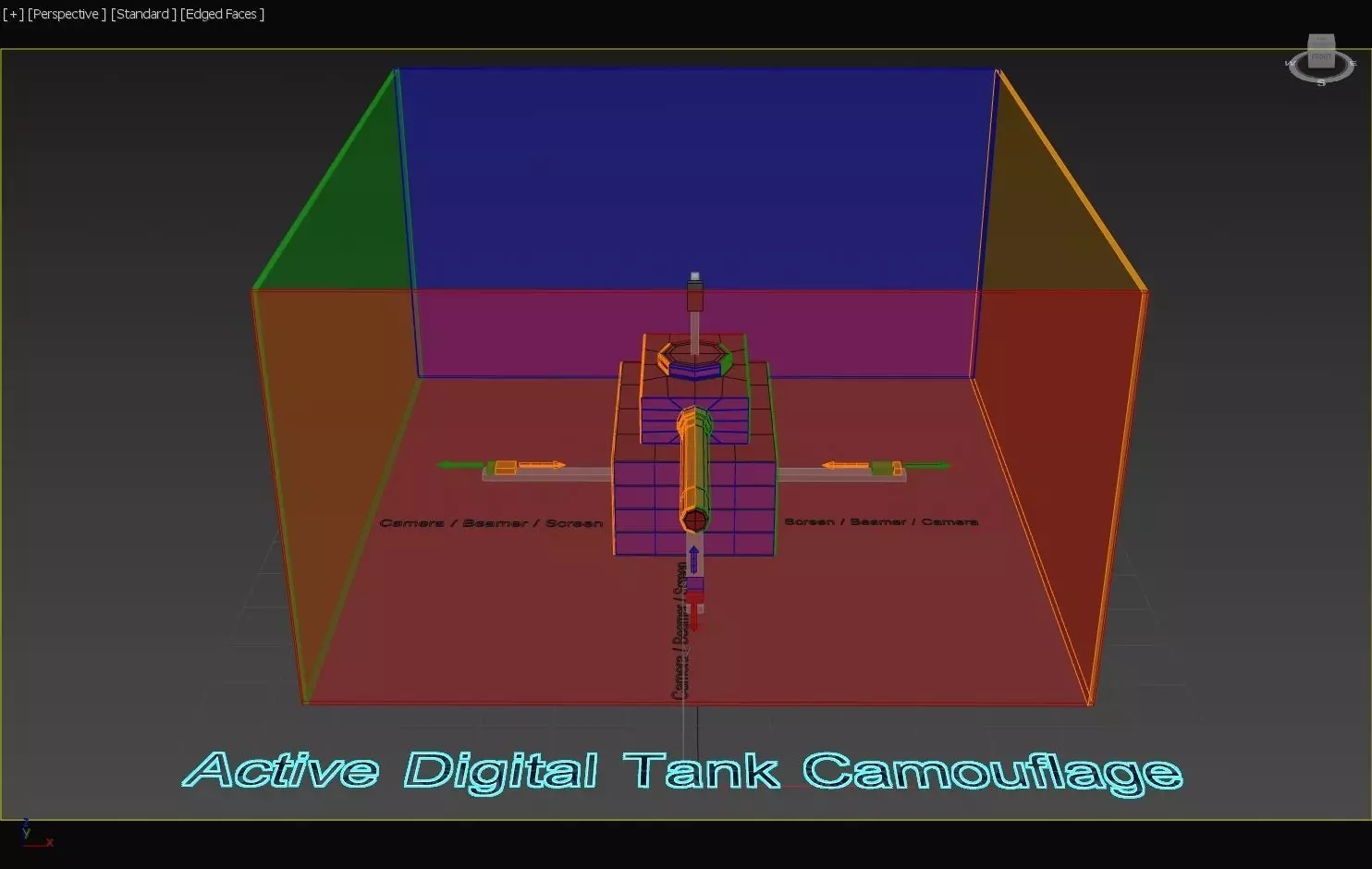 some cars already have some type of faked top views, this digital information could be used to be projected on top of the tanks top surface, making it the actual digital canvas, providing a near perfect digital camouflage. i could have further added letters to explain even more clearly the concept, but i hope the colors help the minds eye to understand the final digital camouflage concept but it all comes down to record one side of the tank, and then project it on the opposite side.
